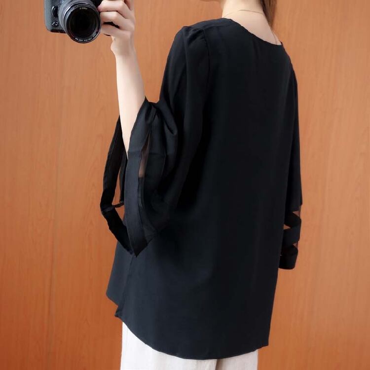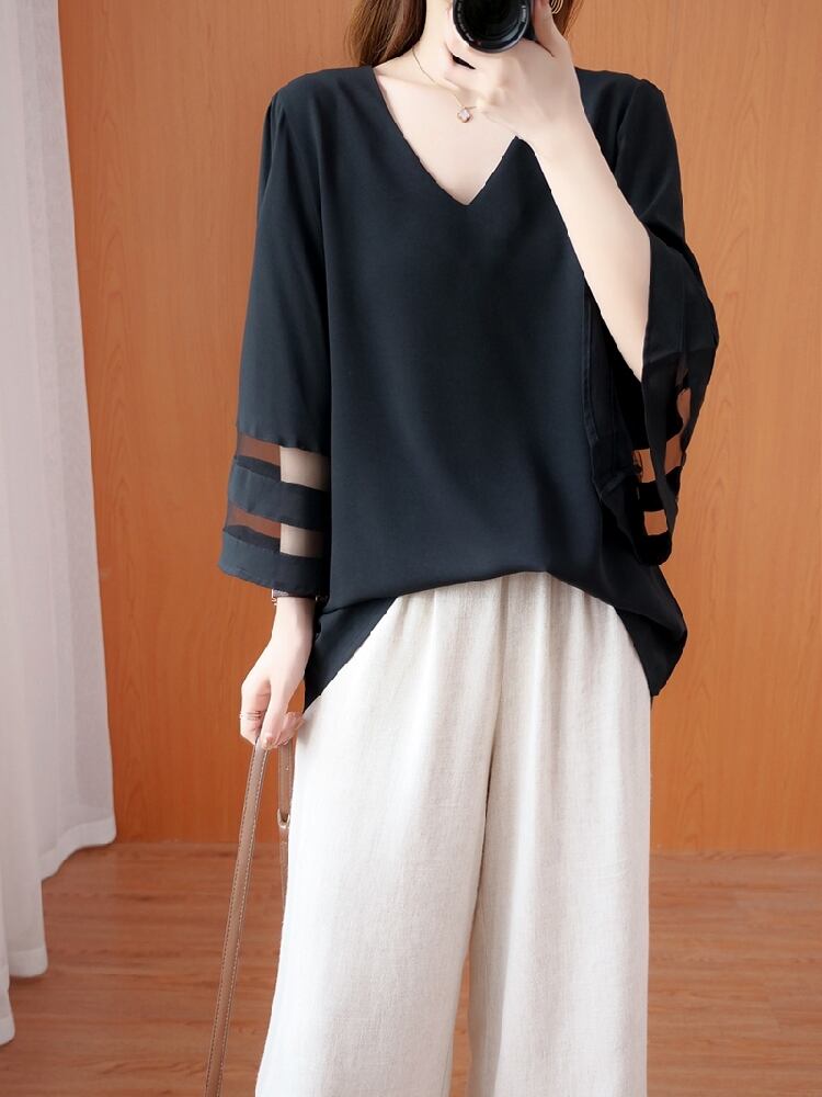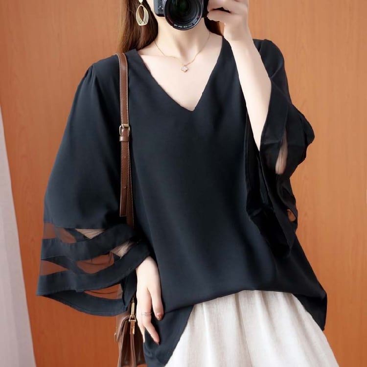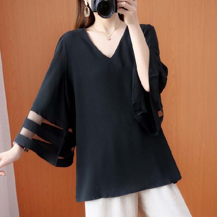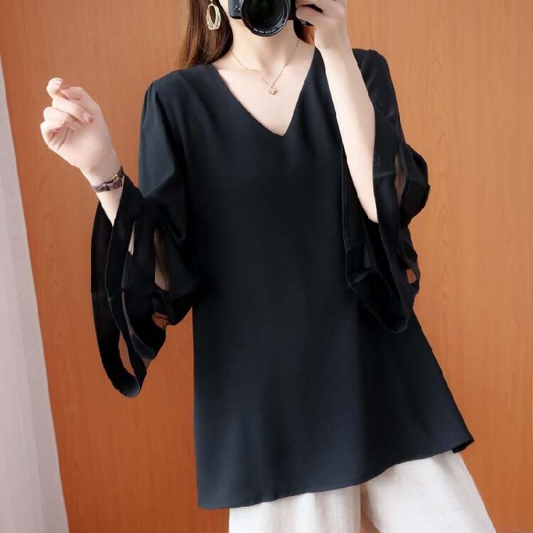 ゆったりサイズで、ラフなスタイリングをお楽しみいただけます。袖がシースルーになっており、透け感があることで涼し気な雰囲気を演出します。Vネックには、チョーカーやネックレスなどのアクセサリーが綺麗に映えますよ。定番の使いやすいカラー展開で、ボトムスを選ばず着こなせます。