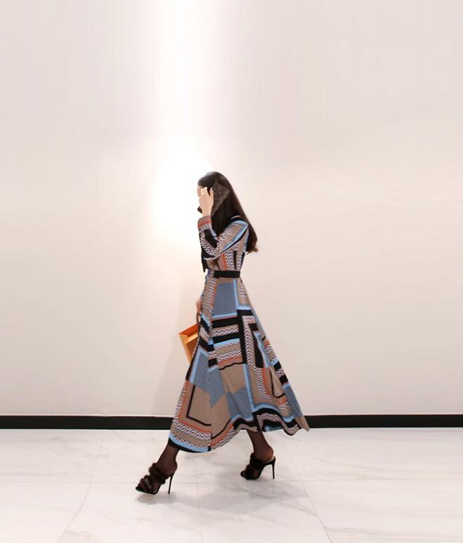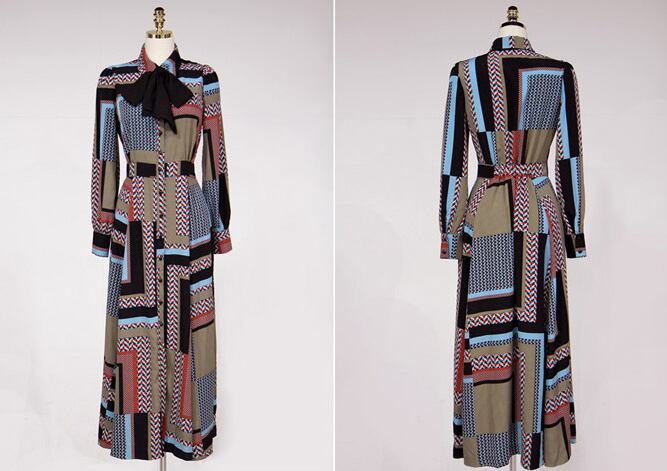 大胆モダンな幾何学柄がおしゃれレトロなデザインのワンピース。