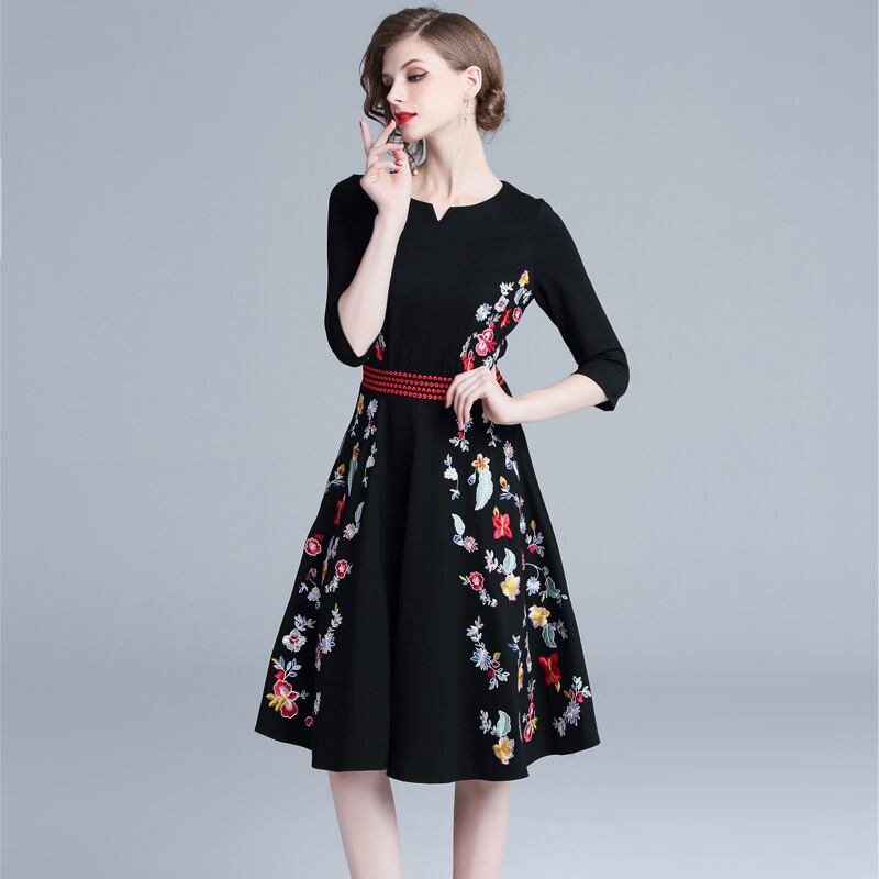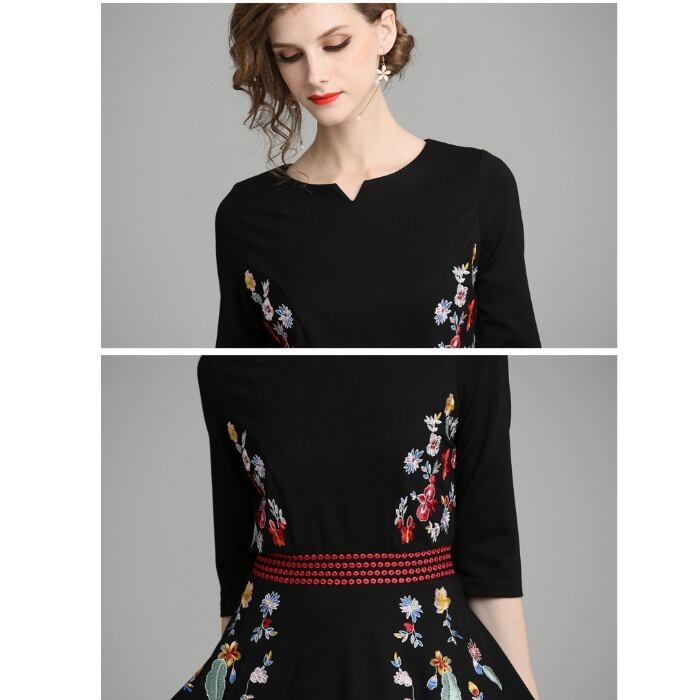 黒い ジンコットン 刺繍 ドレス ワンピース フレアワンピース ひざ丈 七分袖 ラウンドネック Aライン 刺繍 ウエストマーク ハイウエスト 大人可愛い きれいめ シンプル カジュアル 大人 上品 お洒落 大人女子 クール モード系 エレガント 花柄 秋 10代 20代 30代 40代 レディース 女性用 OL 通勤 学生 通学 デート お出かけ 女子会 お泊まり 休日 旅行 高原 ガーデン レストラン 着回し 普段使い S M L XL 2XL ブラック
