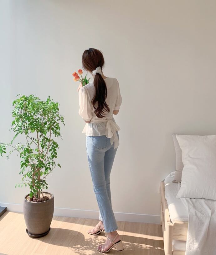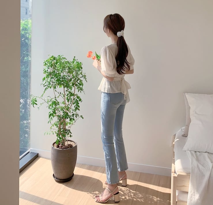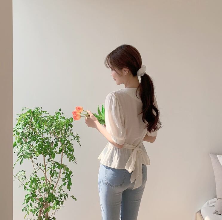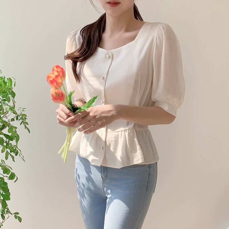 鎖骨をキレイ見せするスクエアネックとふんわりとした袖が清楚な雰囲気。