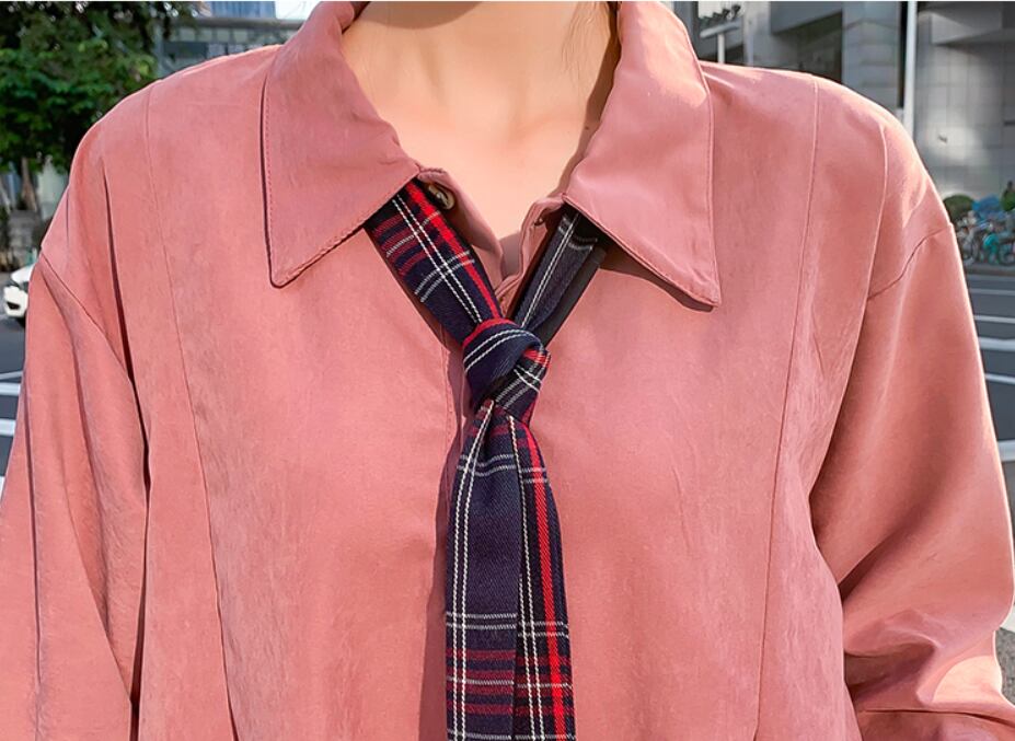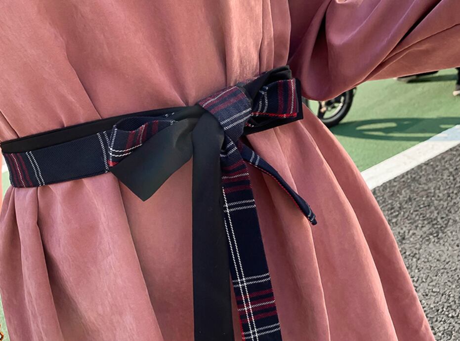チェック柄ベルトを首に下げてさらりと着たり、ウエストに巻いて着たり、
