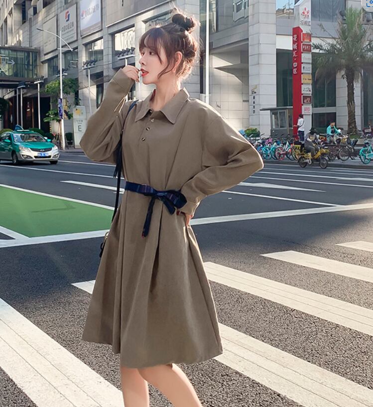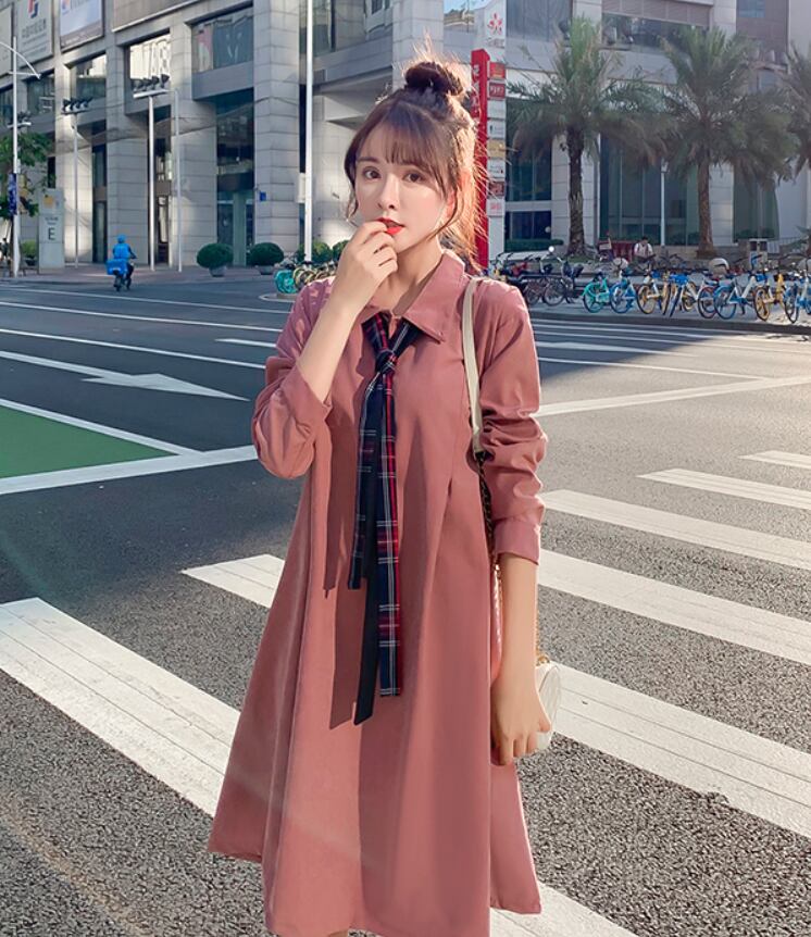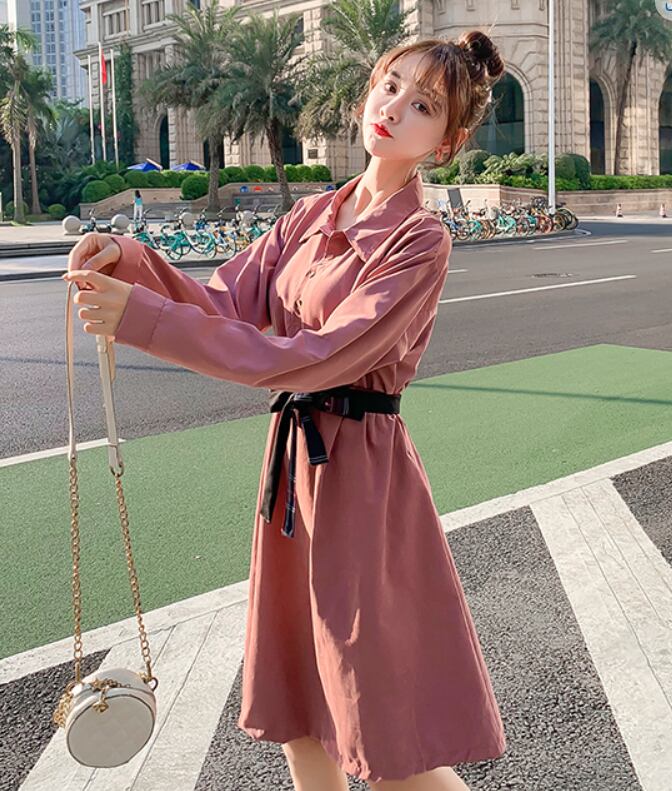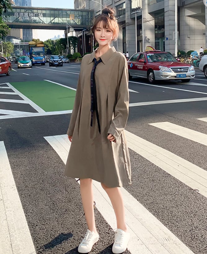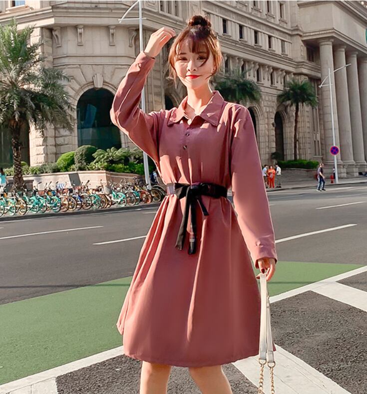3way ワンピース 膝丈 ひざ丈 袖あり 長袖 襟付き Aライン ベルト かわいい シンプル カジュアル ガーリー 無地 チェック柄 春 秋 10代 20代 30代 レディース 女性用 お出かけ 着回し 普段使い 楽ちん 体型カバー M L 緑 グリーン ピンク