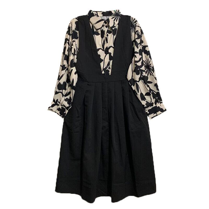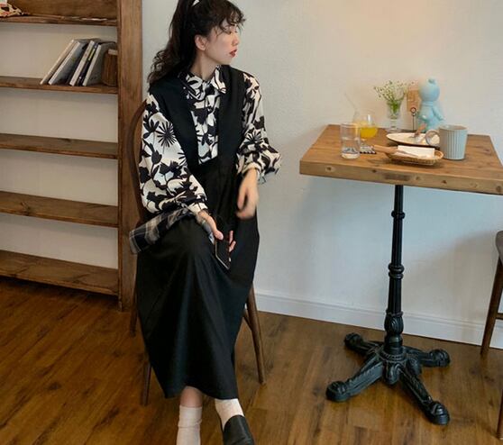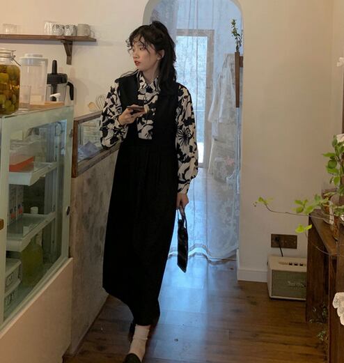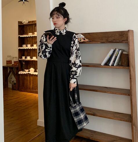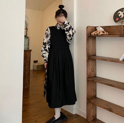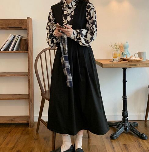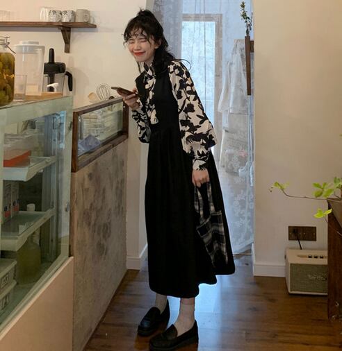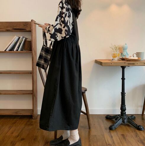 ゆったりサイズ ワンピース サスペンダーワンピ シャツ ロング丈 アンクル丈 袖あり 長袖 襟付き POLO襟 フレア Aライン ハイウエスト 2点セット ツーピース かわいい 大人可愛い おしゃれ レトロ ラフ ラブリー キュート ガーリー 個性的 存在感 パターン柄 春 秋 2022 10代 20代 30代 レディース デート お出かけ 女子会 休日 イベント 旅行 レストラン 着回し 普段使い 重ね着 オルチャン モテ 体系カバー 新作 定番 インスタ映えL XL 2XL 3XL 4XL ブラック