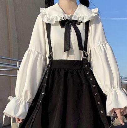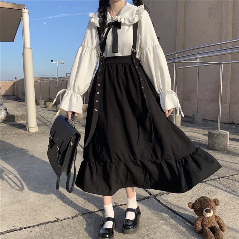 トップス ワンピース ブラウス 膝下 ロング丈 袖あり 長袖 ボリューム袖 襟付き リボン襟 フレア Aライン リボン ハイウエスト サスペンダー 2点セット ツーピース かわいい 大人可愛い おしゃれ ラブリー キュート ガーリー 主役級 カレッジ 無地 春 秋 2022 10代 20代 レディース 学生 デート お出かけ 休日 イベント 着回し 普段使い 重ね着 楽ちん モテ 体系カバー 美脚 新作 インスタ映え コスプレ サイズ S M L 色展開 ホワイト ブラック