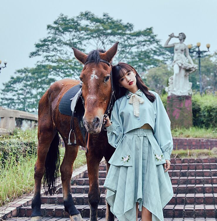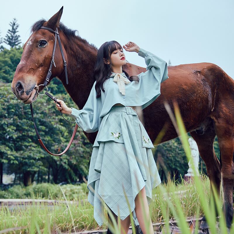 レトロなデザインが可愛いトップス×スカートのセットアップ。