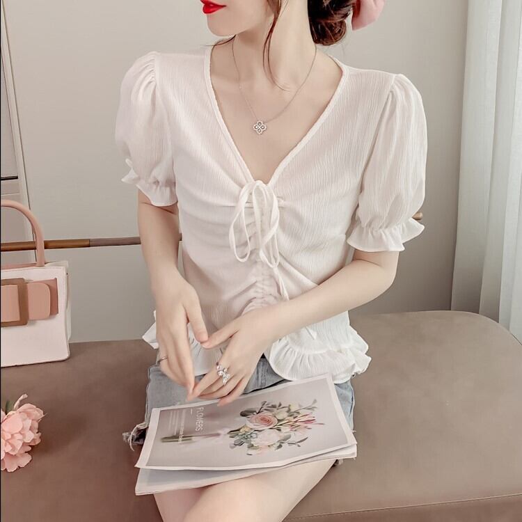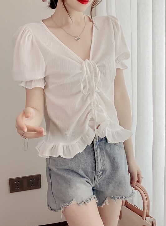 トップス ブラウス ミディアム丈 袖あり 半袖 パフスリーブ Vネック セミフレア ストレート フリル リボン 薄手 かわいい 大人可愛い きれいめ シンプル 上品 おしゃれ 大人女子 ラブリー キュート セクシー エレガント 存在感 とろみ感 無地 春 夏 2022 10代 20代 30代 レディース デート お出かけ 女子会 休日 イベント ホテル レストラン 着回し 普段使い 韓国系 ファッション モテ 新作 インスタ映え フレンチスタイル サイズ S M L XL 色展開 ホワイト