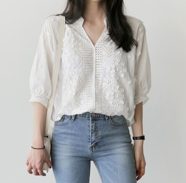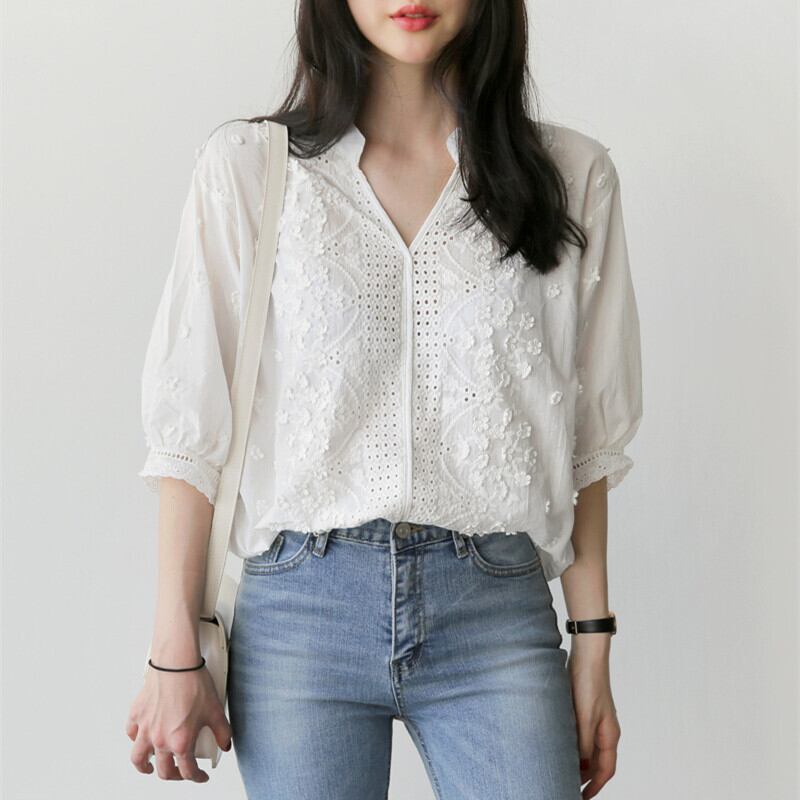 レース刺繡ブラウス トップス ブラウス 袖あり 7分袖 七分袖 Vネック レース 刺繍 かわいい 大人可愛い きれいめ シンプル カジュアル 大人 おしゃれ お洒落 レトロ 大人可愛い 大人女子 こなれ感 キュート ガーリー 個性的 エレガント 主役級 存在感 抜け感 無地 春 夏 秋 10代 20代 30代 レディース OL 通勤 学生 通学 デート お出かけ 女子会 休日 着回し 普段使い 重ね着 サイズ S M L XL 色展開 白 ホワイト