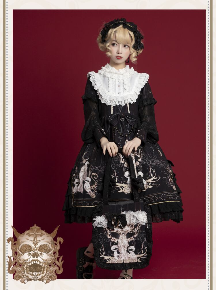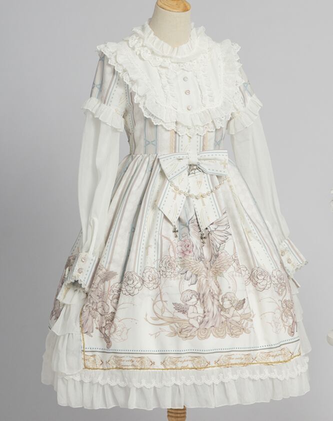 天使の柄がプリントされていてロココなドレスが魅力的。