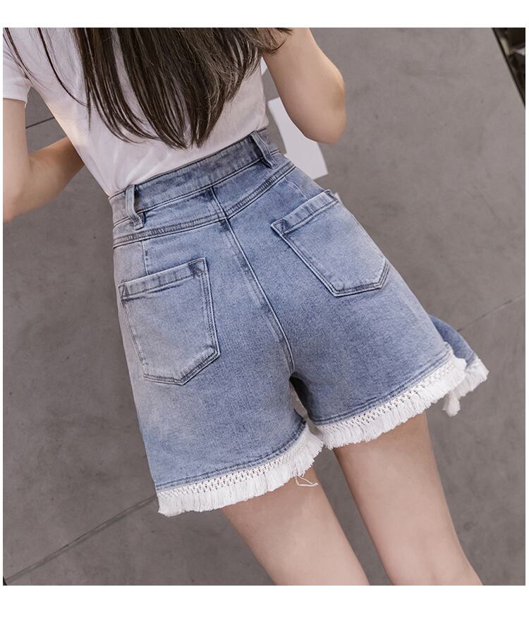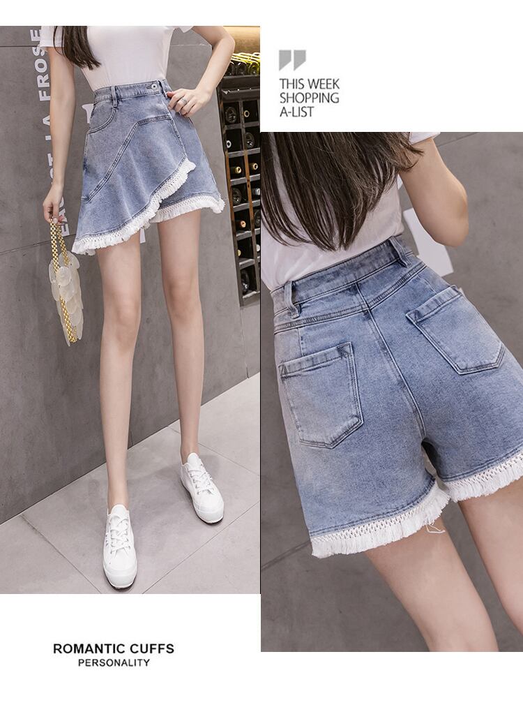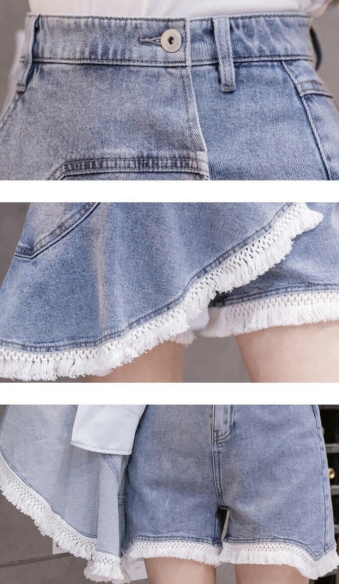 韓国夏女性タッセルパッチワーク緩いカジュアルハイウエストスキニーA字デニムパンツショーツ パンツ ショートパンツ ミニスカート ショート丈 膝上 Aライン ウエストマーク ドッキング ハイウエスト 2way 大人可愛い シンプル カジュアル おしゃれ レトロ 大人女子 こなれ感 ラフ キュート 無地 夏 10代 20代 レディース 女性用 OL 通勤 学生 通学 お出かけ 女子会 お泊まり 旅行 着回し 普段使い 韓国 S M L XL 2XL ブルー