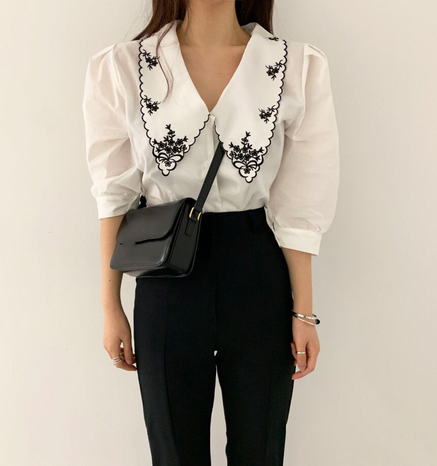 夏女性スタイリッシュヴィンテージ5分袖学生人形襟シャツ トップス シャツ 白シャツ ミディアム丈 半袖 5分袖 Vネック 襟付き ストレート 刺繍 前開き 透け感 大人可愛い きれいめ シンプル カジュアル 大人 上品 お洒落 かっこいい レトロ 大人女子 こなれ感 ラフ ラブリー キュート ガーリー 抜け感 柄 花柄 小花柄 春 夏 10代 20代 30代 レディース 女性用 OL 通勤 学生 通学 デート お出かけ 女子会 お泊まり 休日 リゾート 旅行 高原 ガーデン 着回し 重ね着 M L XL