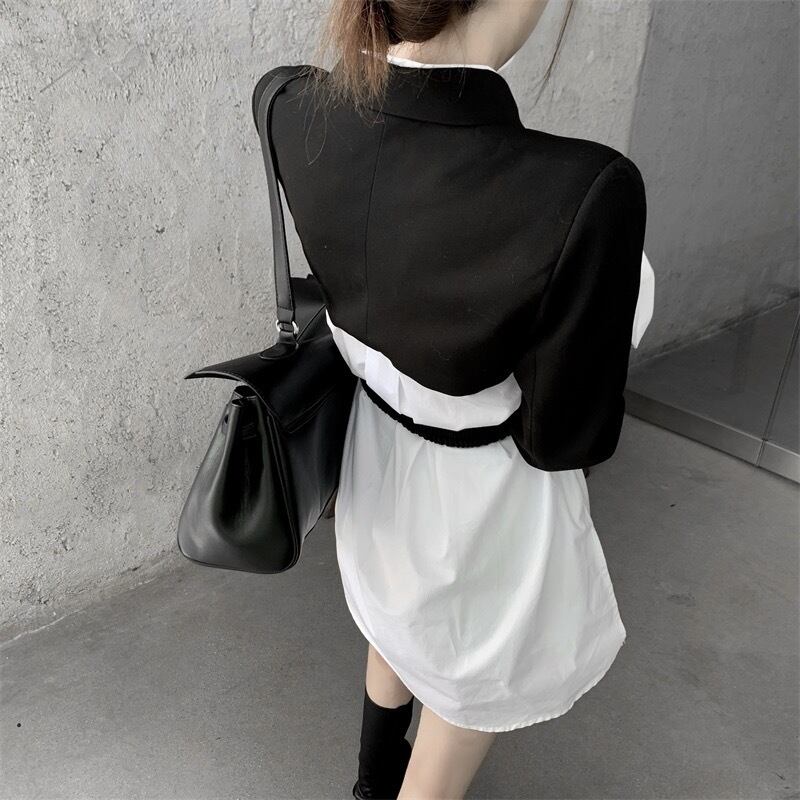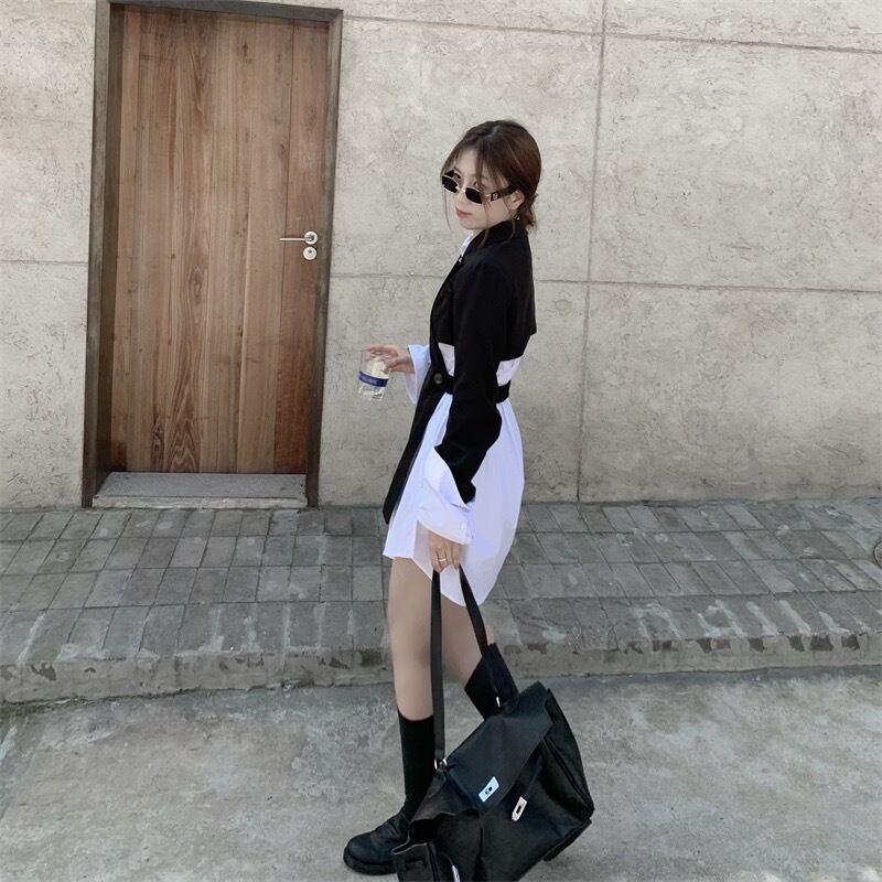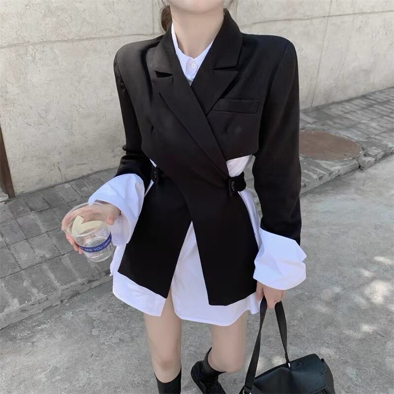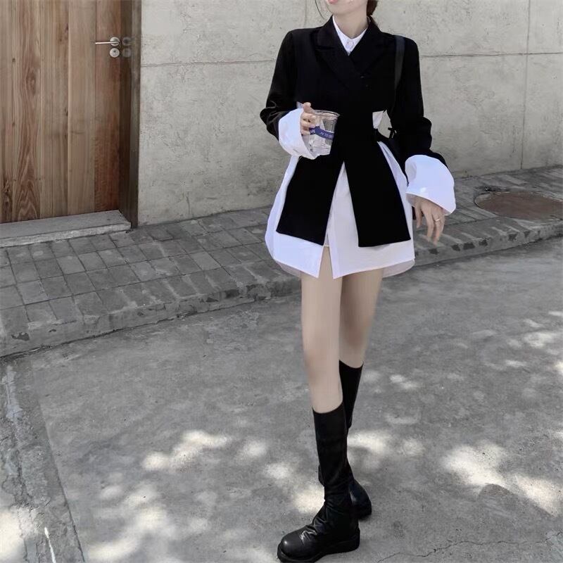 ツーピース トップス アウター 上着 スーツ 白シャツ ロング丈 袖あり 長袖 ボリューム袖 襟付き POLO襟 Aライン アシンメトリー ウエストマーク ハイウエスト 2点セット かわいい 大人可愛い きれいめ おしゃれ かっこいい 大人女子 ルーズ 個性的 クール モード系 モダン 主役級 無地 春 秋 2022 10代 20代 30代 レディース 学生 デート お出かけ 女子会 休日 パーティー イベント ホテル レストラン 着回し 普段使い 重ね着 韓国系 ファッション モテ 新作 インスタ映え