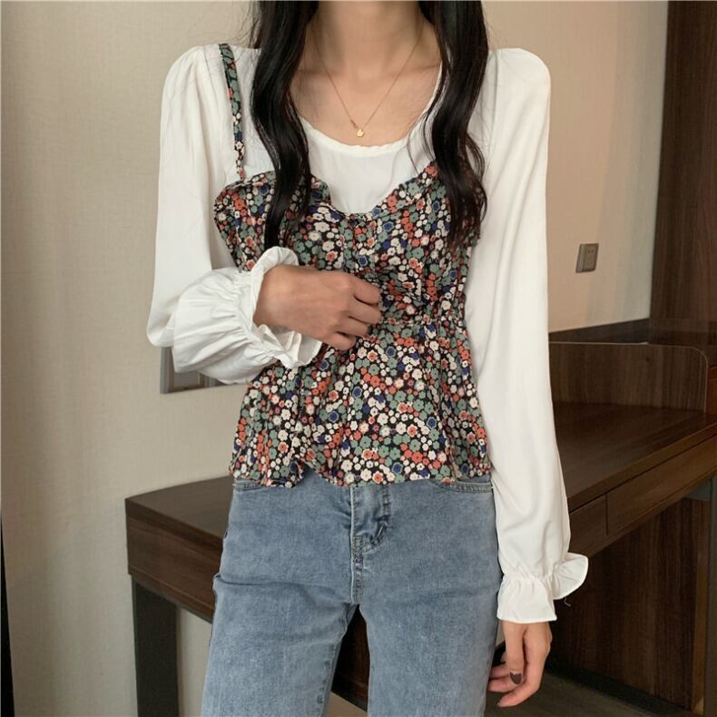 重ね着風 トップス シャツ ミディアム丈 袖あり 長袖 フレアスリーブ ラウンドネック フレア ペプラム フリル 薄手 2点セット ツーピース かわいい 大人可愛い カジュアル おしゃれ こなれ感 ラブリー キュート ガーリー 存在感 抜け感 小花柄 秋 冬 10代 20代 30代 レディース デート お出かけ 女子会 休日 イベント 旅行 着回し 普段使い 重ね着 オルチャン モテ 定番 トレンド インスタ映え サイズ S M L 色展開 レッド ブルー オレンジ