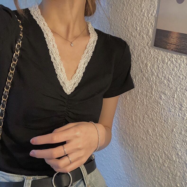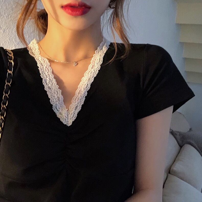 トップス Tシャツ ミディアム丈 袖あり 半袖 Vネック ストレート レース シンプル カジュアル 上品 おしゃれ レトロ 大人可愛い 大人女子 こなれ感 ラブリー キュート クール 抜け感 無地 春 夏 10代 20代 30代 レディース デート お出かけ 女子会 休日 イベント 旅行 海 プール 着回し 普段使い モテ インスタ映え フレンチスタイル サイズ S M L XL 2XL 色展開 ブラック