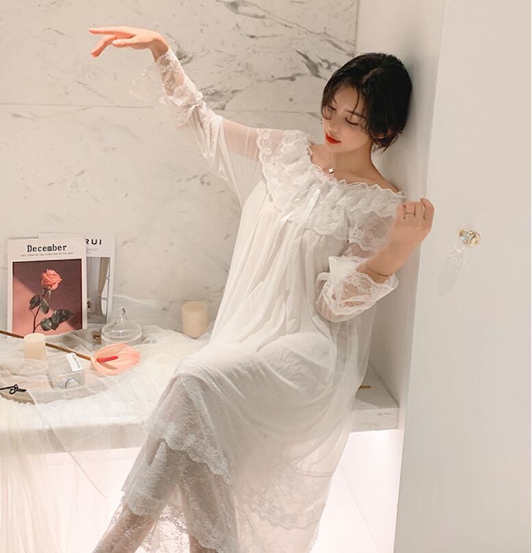 ルームウェア パジャマ 部屋着 寝巻き ナイトウェア ロング丈 袖あり 長袖 萌袖 袖コンシャス オフショルダー レース フリル 透け感 かわいい シンプル 大人可愛い ラブリー キュート 存在感 無地 春 夏 10代 20代 30代 40代 レディース 女性用 ママ マタニティ お泊まり 旅行 体型カバー S M L 白 ホワイト 青 ブルー