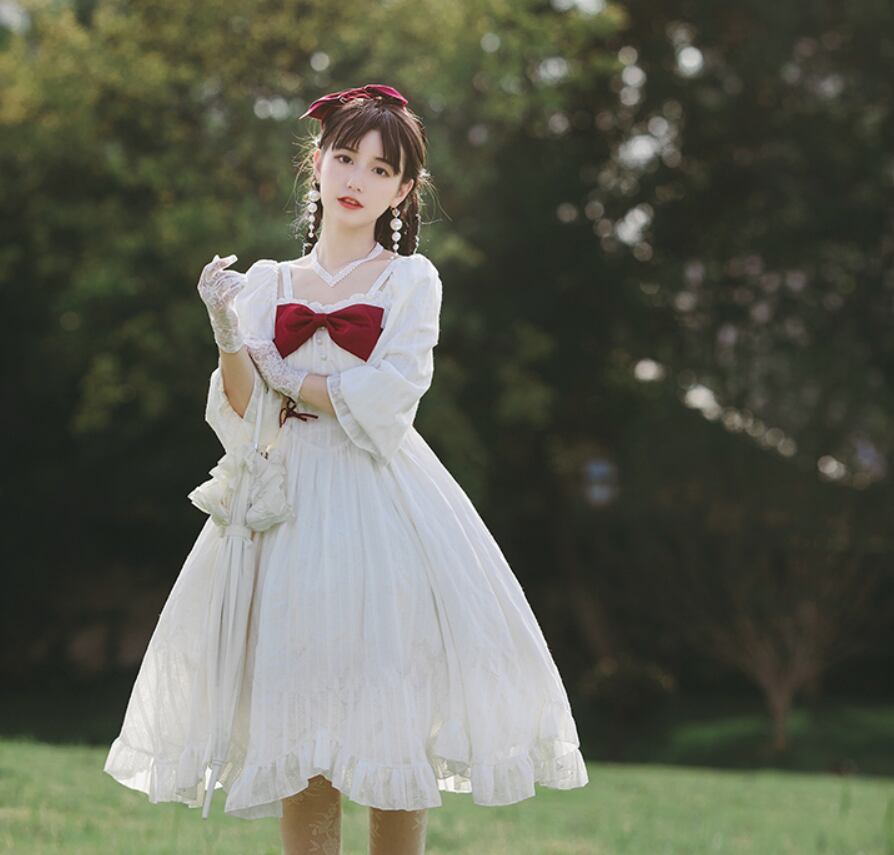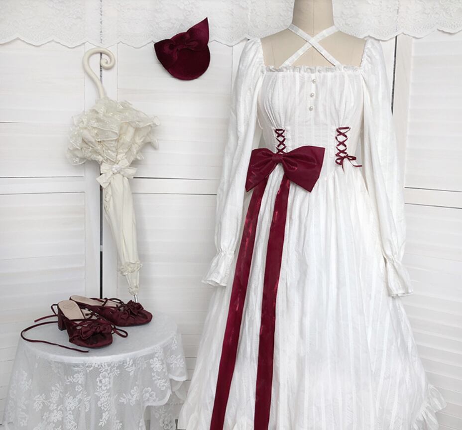 大きな赤いリボンベルト付きのプリンセス風ワンピース。
