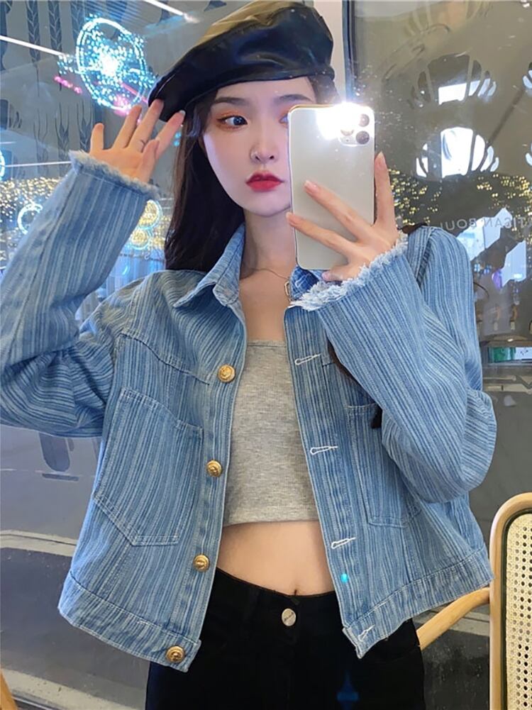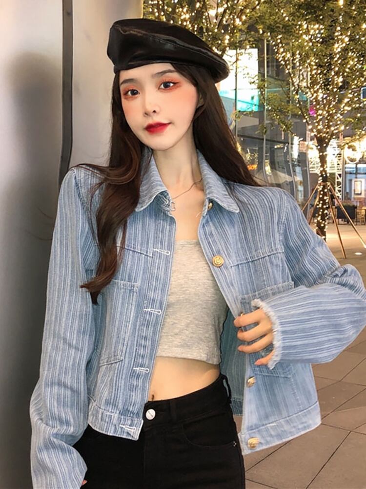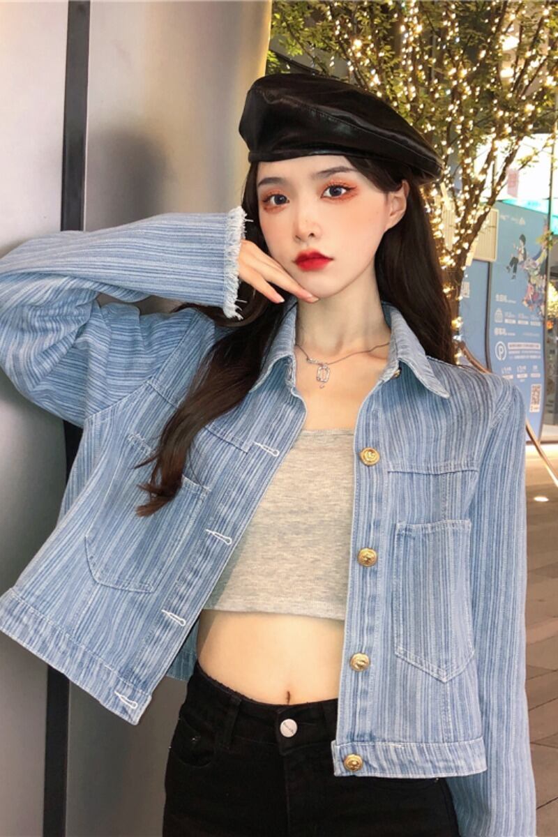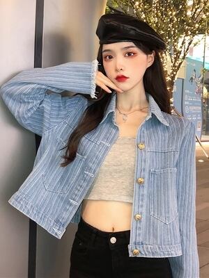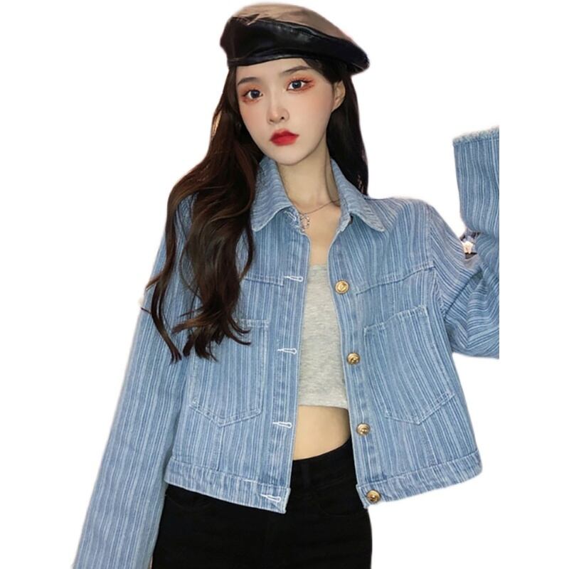 ストライプ柄デニムジャケット トップス ジャケット Gジャン ショート ショート丈 袖あり 長袖 襟付き 前開き 綿 デニム かわいい 大人可愛い きれいめ シンプル カジュアル 大人 おしゃれ お洒落 レトロ 大人可愛い 大人女子 こなれ感 キュート ガーリー 個性的 主役級 存在感 抜け感 柄 ストライプ 春 秋 10代 20代 30代 レディース 学生 通学 デート お出かけ 女子会 休日 着回し 普段使い 重ね着 韓国系 オルチャン サイズ S M L XL 色展開 青 ブルー