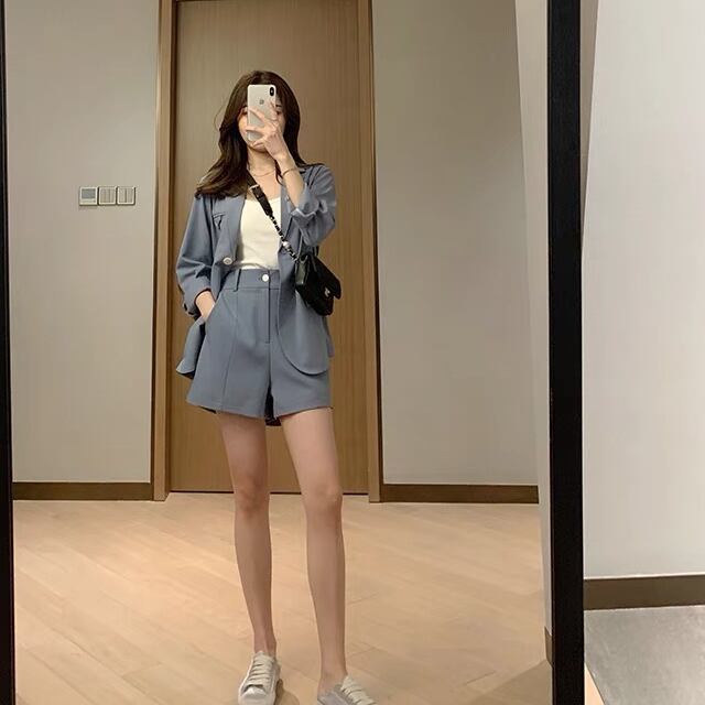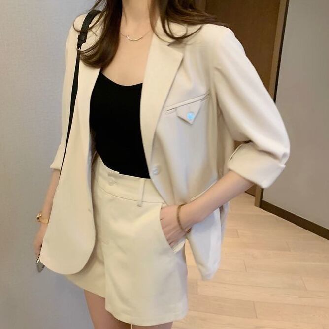 韓国で定番のスタイル、セットアップスーツです。ショートパンツと、カチッとしたテーラードジャケットのバランスがハイセンスな着こなしに。セットなのでコーデに迷いません。インナーを変えたり、ベルトでアクセントをつけたりとアレンジ次第でバリエーション豊富なスタイリングが楽しめます。