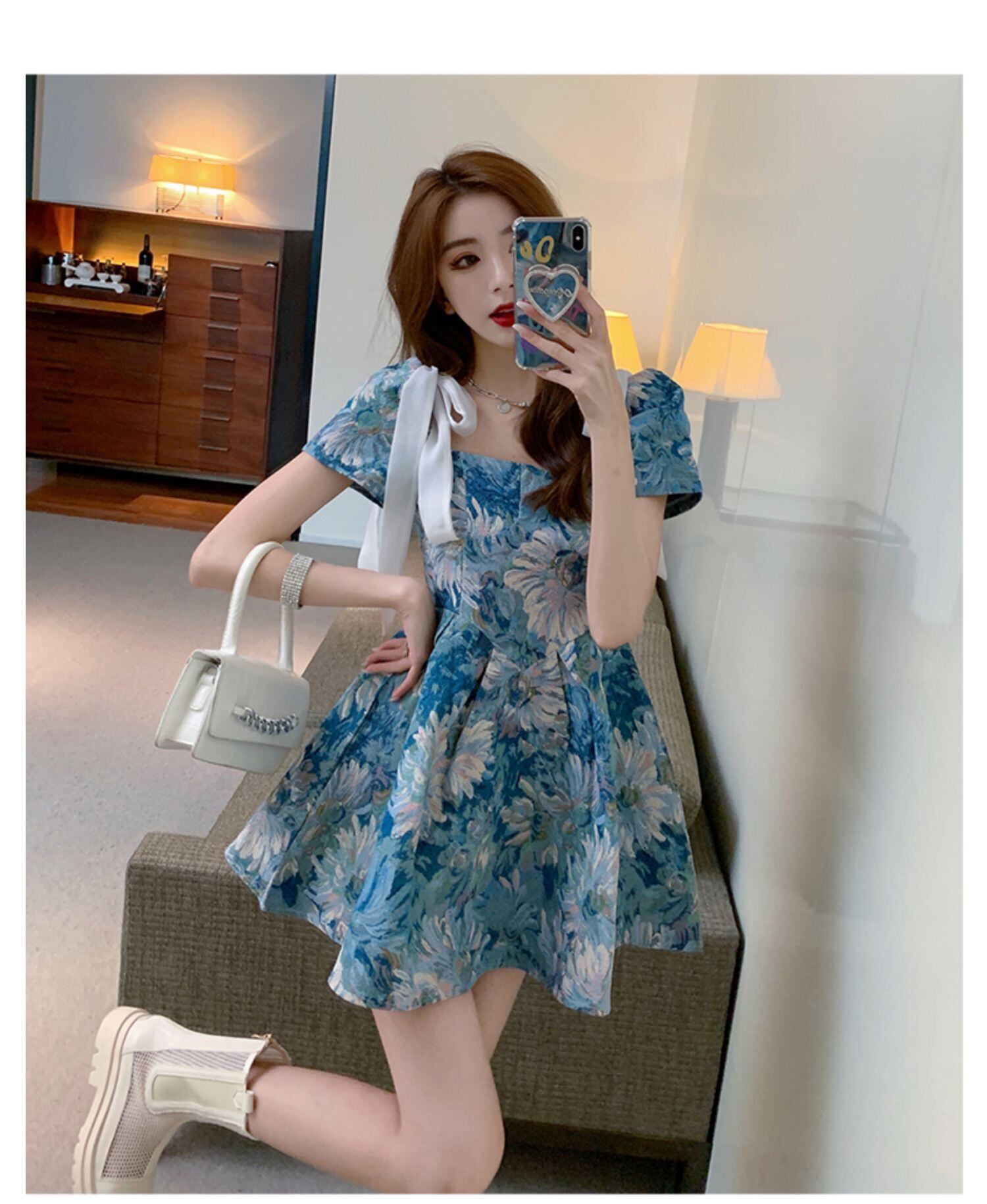 花柄ワンピース ワンピース フレアワンピース ワンピドレス ミニ ミニ丈 袖あり 半袖 スクエアネック フレア Aライン リボン かわいい 大人可愛い きれいめ シンプル カジュアル 大人 おしゃれ お洒落 レトロ 大人可愛い 大人女子 こなれ感 キュート ガーリー 個性的 主役級 存在感 抜け感 柄 花柄 春 夏 10代 20代 30代 レディース 学生 通学 デート お出かけ 女子会 休日 着回し 普段使い 重ね着 サイズ S M L XL 2XL 色展開 青 ブルー