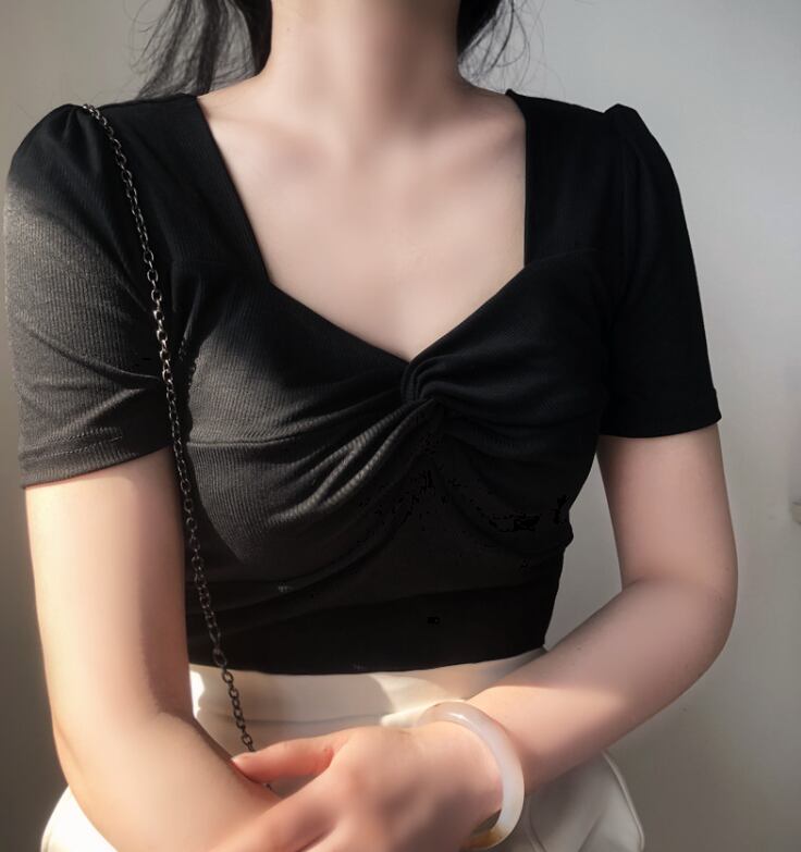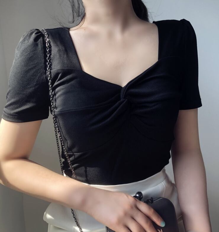 ツイストデザインTシャツ トップス Tシャツ カットソー ショート ショート丈 袖あり 半袖 Vネック 綿 かわいい 大人可愛い きれいめ シンプル カジュアル 大人 おしゃれ お洒落 レトロ 大人可愛い 大人女子 こなれ感 キュート ガーリー 個性的 主役級 存在感 抜け感 無地 春 夏 10代 20代 30代 レディース OL 通勤 学生 通学 デート お出かけ 女子会 休日 着回し 普段使い 重ね着 サイズ M L XL 2XL 3XL 色展開 黒 ブラック