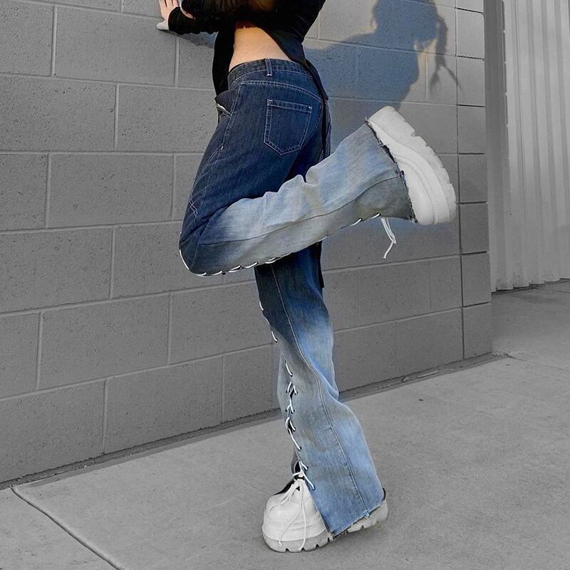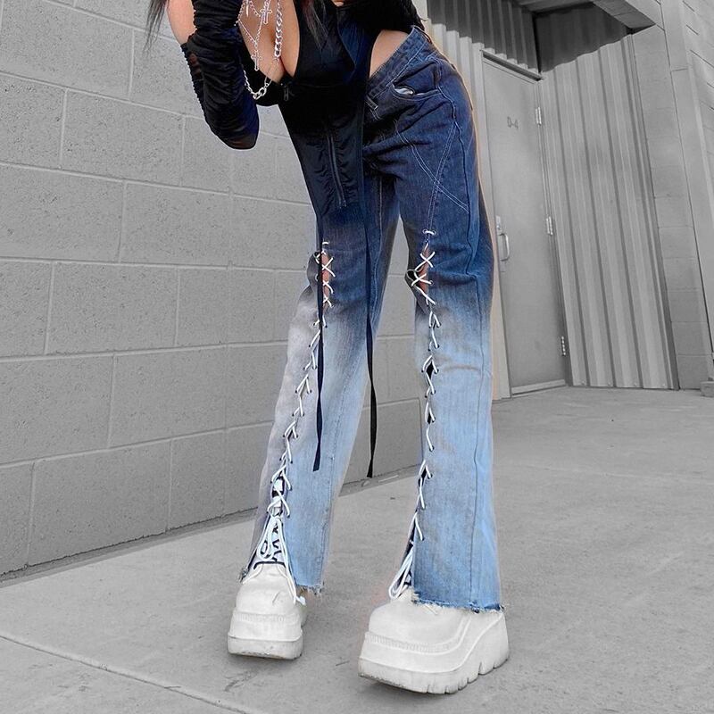 フロントのレースアップがおしゃれなデニムパンツ。