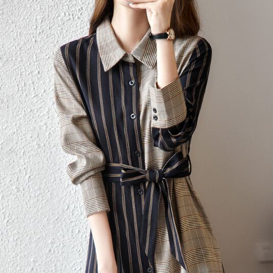 ワンピース シャツワンピース 膝丈 袖あり 長袖 襟付き POLO襟 セミフレア Aライン ウエストリボン 切り替えデザイン ドッキング ポケット ハイウエスト かわいい 大人可愛い きれいめ 上品 おしゃれ 大人女子 こなれ感 ラブリー キュート ガーリー 主役級 存在感 チェック柄 ストライプ 秋 冬 2021 20代 30代 40代 レディース 通勤 デート お出かけ 女子会 休日 イベント レストラン 着回し 普段使い 重ね着 モテ 美脚 インスタ映え ヨーロピアン S M L XLグレー