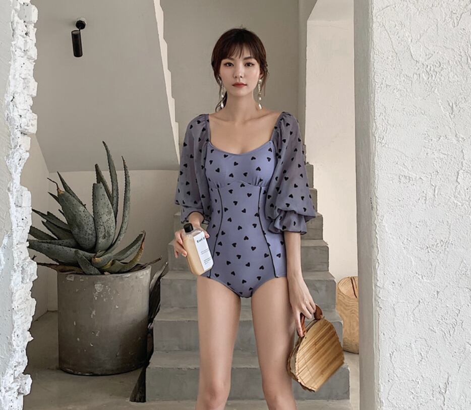 水着 スイムウェア ワンピース水着 ワンピース 二の腕カバー ボリューム袖 大人可愛い おしゃれ お洒落 ハート柄 10代 20代 30代 40代 レディース 女性用 ママ 女の子 夏 海 ビーチ プール リゾート 旅行 M L XL 青 ブルー
