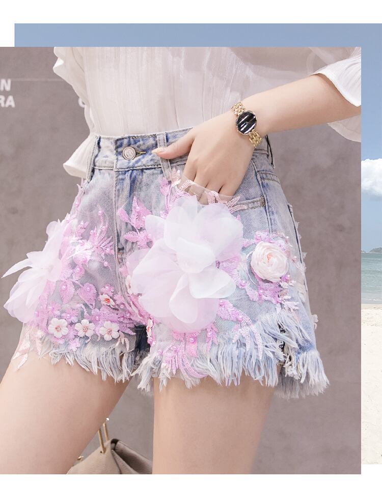 大きなフラワーモチーフが目をひくフリンジデニムショートパンツ。