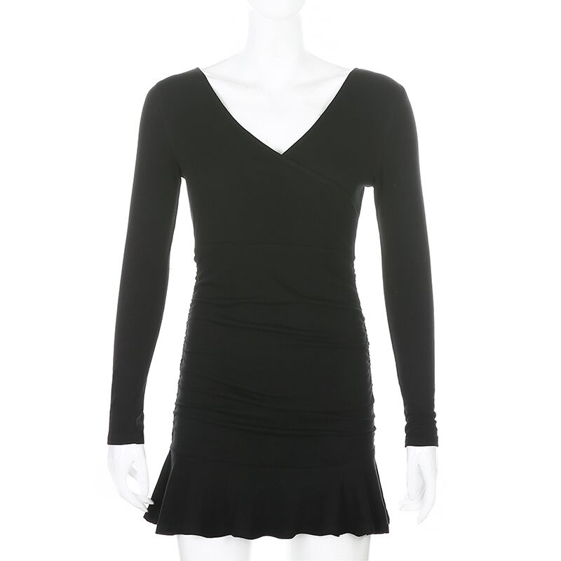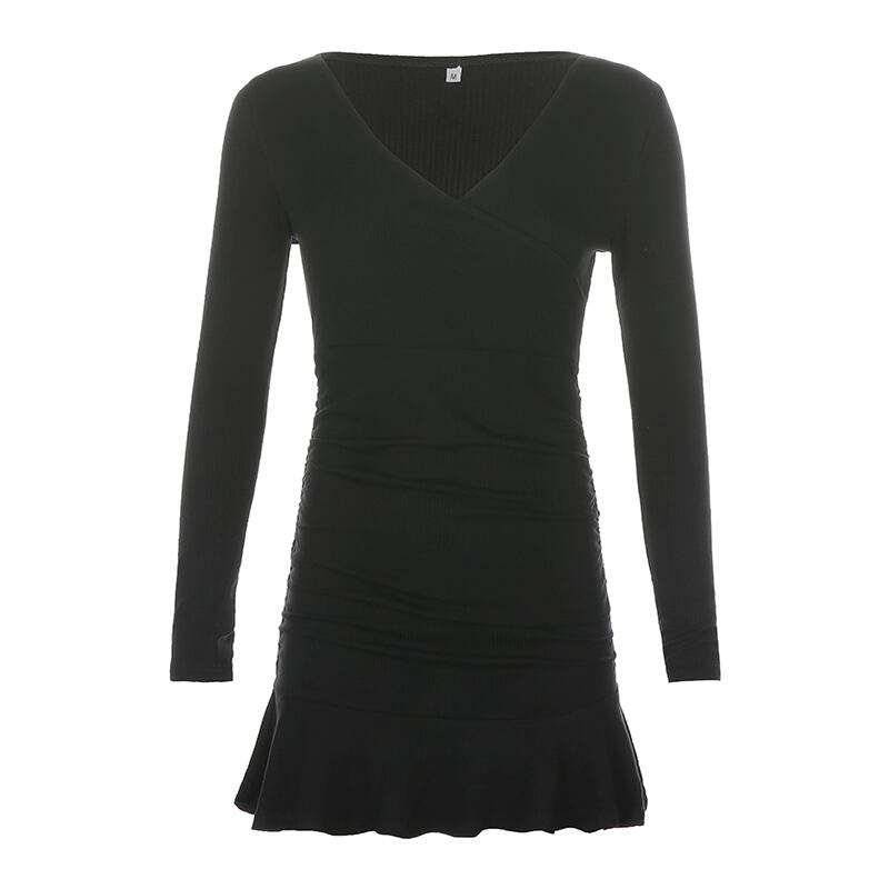 フレンチVネックハスエッジクロスドレスウエスト細いスリムショートブラックドレス ワンピース ワンピドレス ミニ丈 膝上 袖あり 長袖 萌袖 Vネック フレア シフォン ハイウエスト 大人可愛い きれいめ シンプル カジュアル 大人 おしゃれ かっこいい 大人女子 こなれ感 ラフ クール モード系 セクシー 無地 冬 10代 20代 30代 レディース 女性用 OL 通勤 学生 通学 デート お出かけ 女子会 お泊まり 休日 旅行 着回し 普段使い S M L XL ブラック