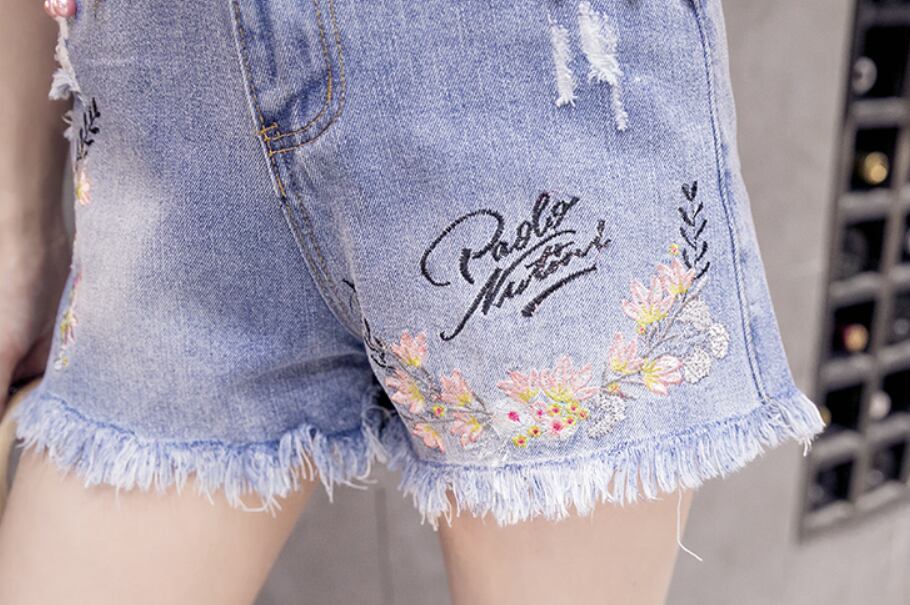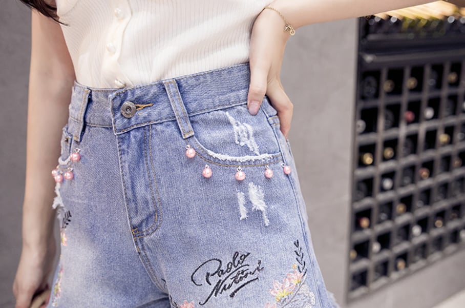 刺繍とフリンジが目をひくデニムショートパンツ。