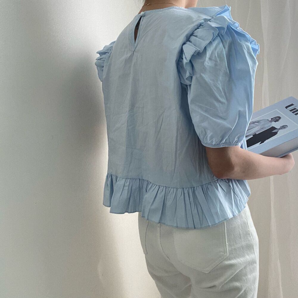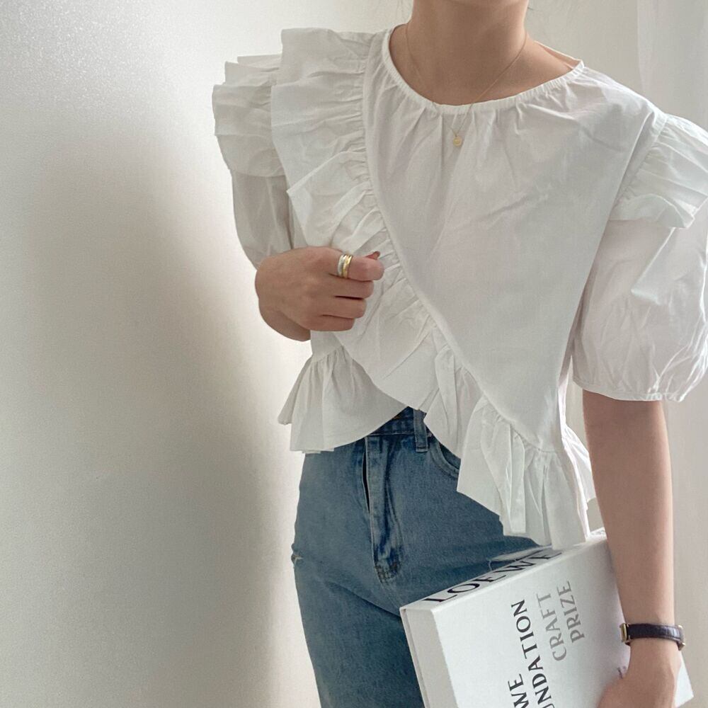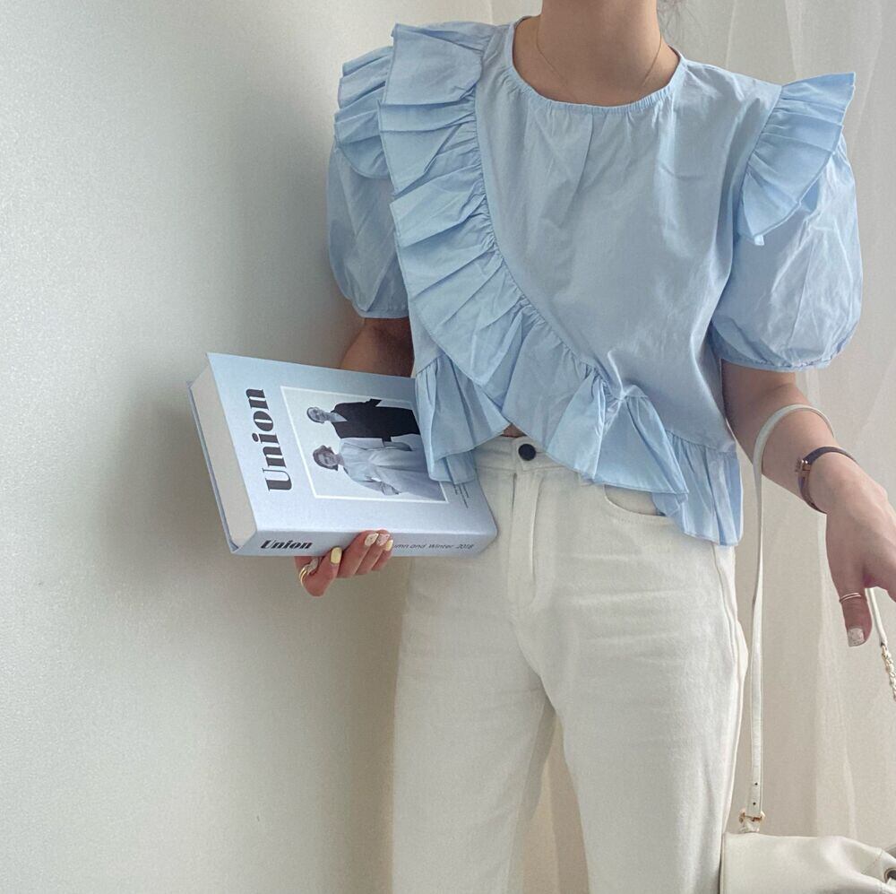 トップス シャツ ショート丈 袖あり 半袖 パフスリーブ ラウンドネック ワイド フリル ハイウエスト 薄手 かわいい 大人可愛い シンプル カジュアル おしゃれ 大人女子 こなれ感 ラブリー キュート ガーリー 抜け感 無地 春 夏 2022 10代 20代 レディース 学生 デート お出かけ 休日 イベント 旅行 海 プール 着回し 普段使い オルチャン モテ 新作 インスタ映え フリーサイズ 色展開 ホワイト ライトブルー
