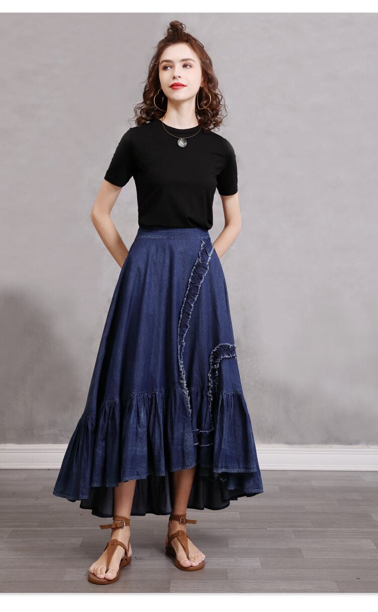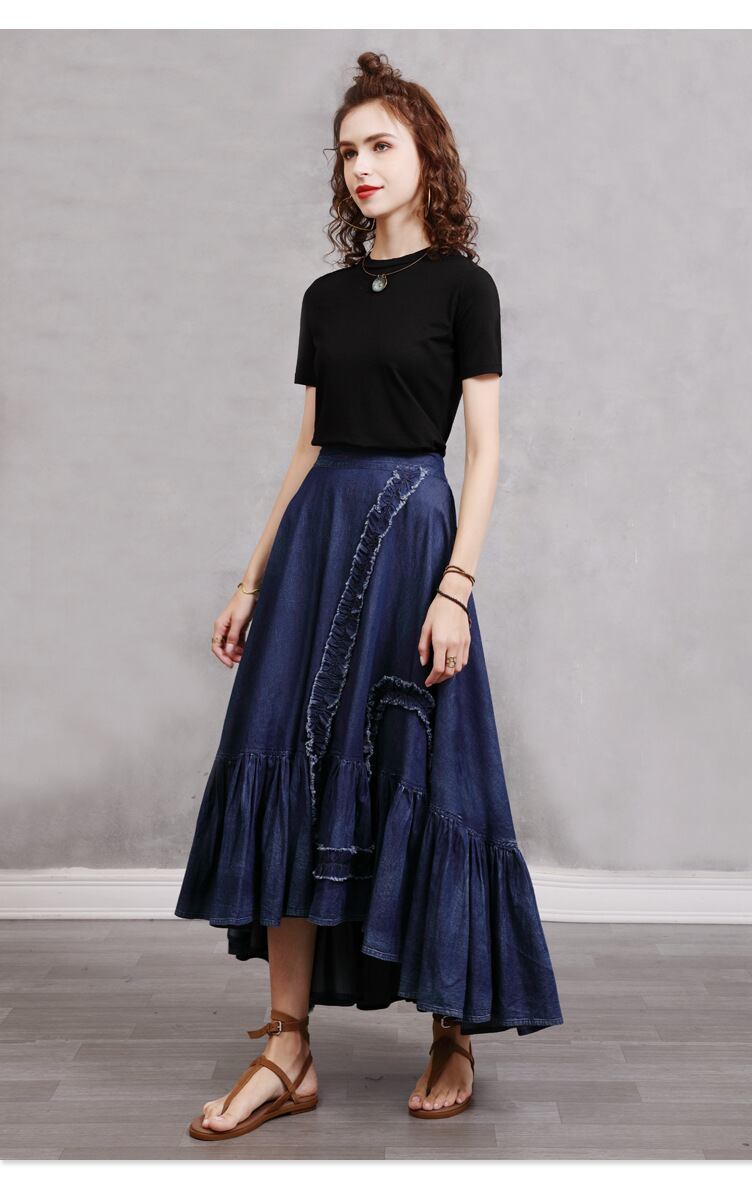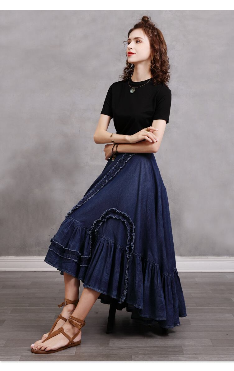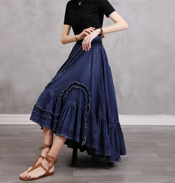 デニムティアードスカート スカート ボトムス フレアスカート ロング ロング丈 マキシ マキシ丈 フレア Aライン アシンメトリー フリル ハイウエスト デニム かわいい 大人可愛い きれいめ シンプル カジュアル 大人 上品 おしゃれ お洒落 大人可愛い 大人女子 こなれ感 キュート ガーリー 個性的 主役級 存在感 とろみ感 無地 春 夏 秋 10代 20代 30代 レディース 学生 通学 デート お出かけ 女子会 休日 着回し 普段使い サイズ S M L XL 色展開 青 ブルー