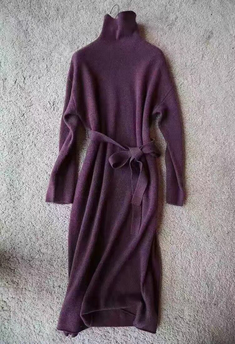 ワンピース 膝丈 ひざ丈 袖あり 長袖 ドロップショルダー ハイネック Aライン ウエストリボン ハイウエスト 伸縮性 シンプル カジュアル おしゃれ お洒落 こなれ感 無地 秋 冬 20代 30代 40代 50代 レディース 女性用 ママ デート お出かけ 休日 普段使い 楽ちん 体型カバー M L XL 2XL 紫 パープル