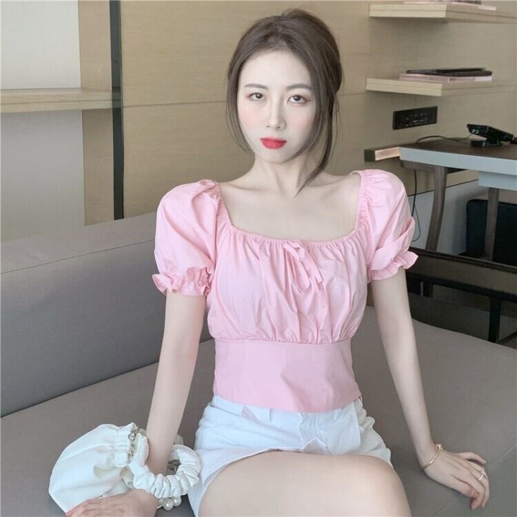 シャーリングとパフスリーブが可愛いショート丈のブラウス。