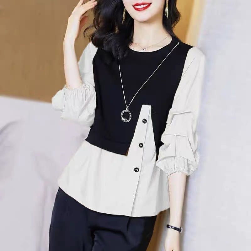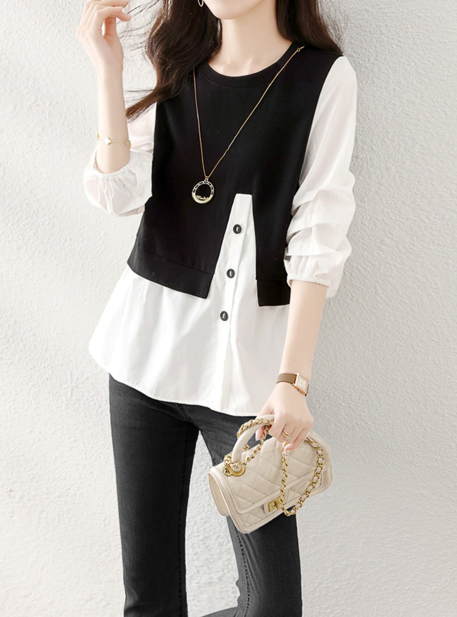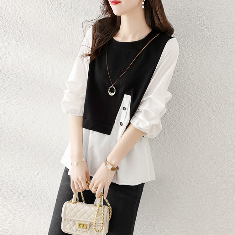 フェイクツーピース トップス シャツ ベスト 袖あり 七分袖 ボリューム袖 ラウンドネック ストレート アシンメトリー サイドスリット 切り替えデザイン ドッキング きれいめ シンプル カジュアル 大人 おしゃれ かっこいい 大人女子 こなれ感 ルーズ クール モード系 エレガント モダン 主役級 無地 春 秋 2022 30代 40代 50代 レディース 通勤 デート お出かけ 休日 イベント レストラン 着回し 普段使い 韓国系 ファッション モテ 新作 トレンド S M L XL 2XL