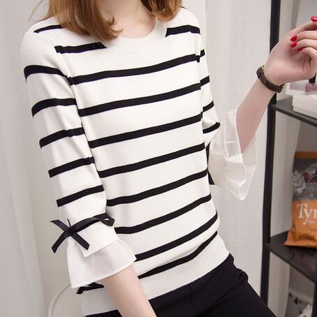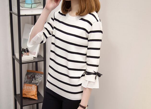 トップス セーター ミディアム丈 袖あり 七分袖 ラウンドネック ストレート シフォン フリル リボン ニット 薄手 ストライプ 春 秋 20代 30代 40代 レディース ママ デート お出かけ 公園デビュー 休日 旅行 着回し 普段使い 韓国系 ファッション 楽ちん モテ 定番 サイズ S M L 色展開 ホワイト ブラック