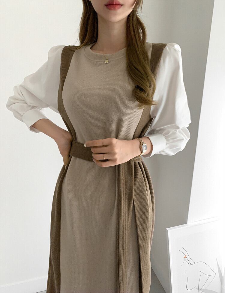 ニット×ブラウスのドッキングデザインがおしゃれなワンピース。