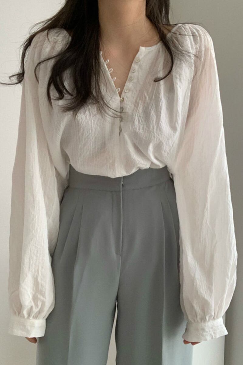 きれいめボトムスでもカジュアルボトムスでも様になる、着回し力抜群のブラウスです。
