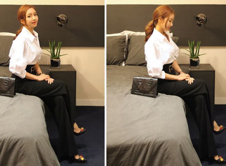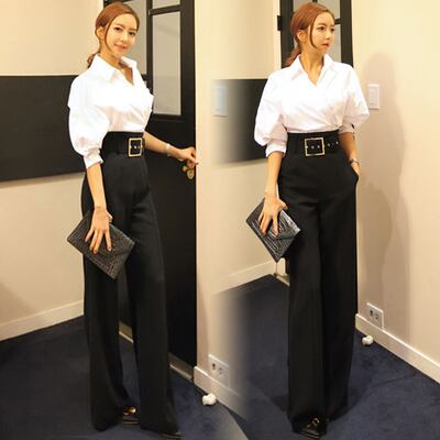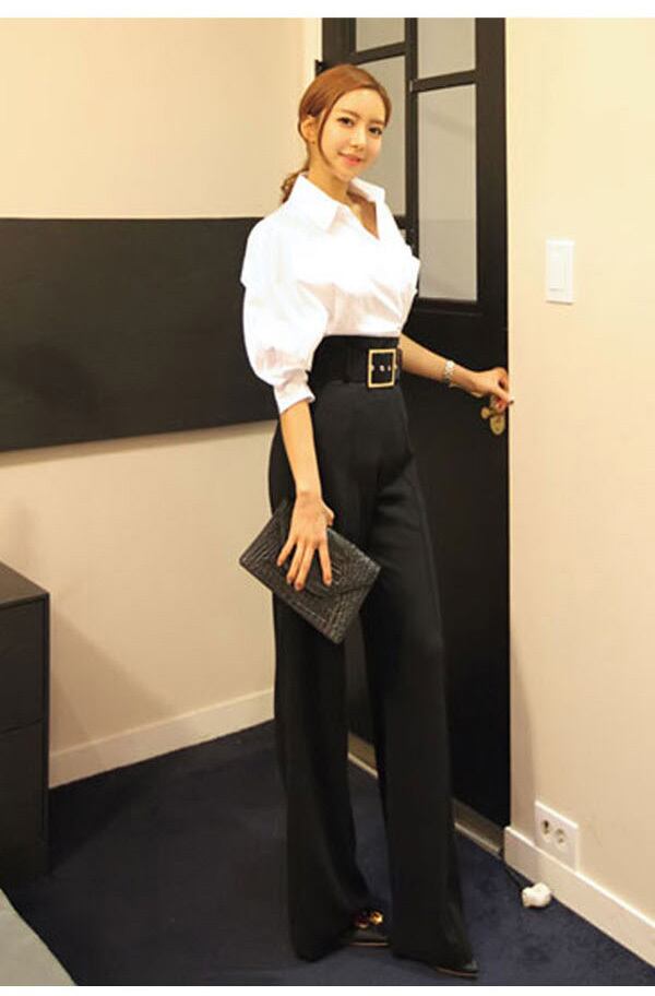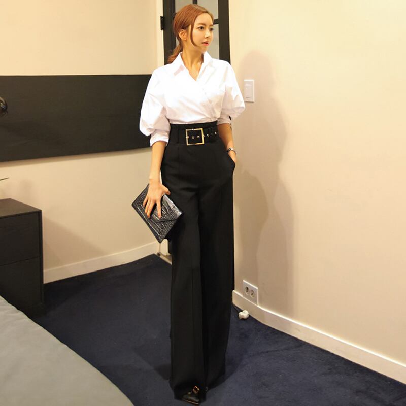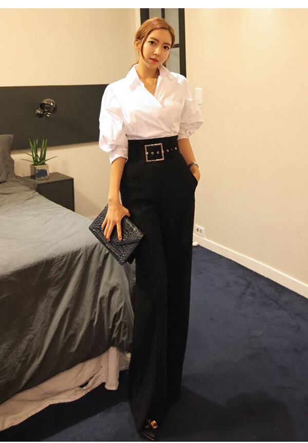大人っぽく洗練された印象のストレートワイドパンツとブラウスのセット。
