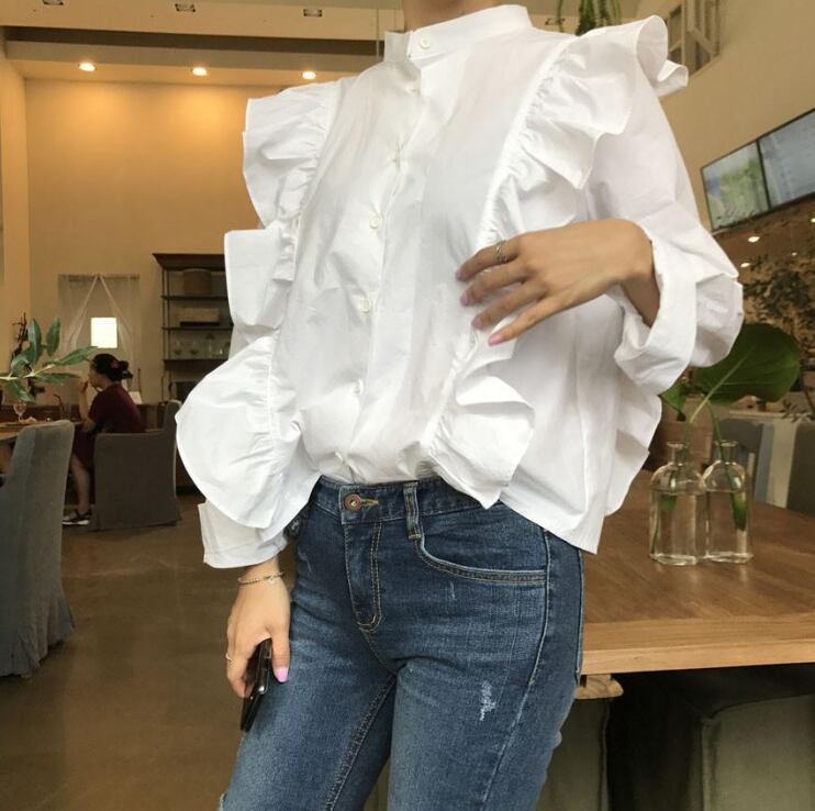 フリルブラウス トップス ブラウス 袖あり 長袖 スタンドカラー フリル 前開き かわいい 大人可愛い きれいめ シンプル カジュアル 大人 上品 おしゃれ お洒落 レトロ 大人可愛い 大人女子 こなれ感 ラフ キュート ルーズ 主役級 存在感 無地 春 秋 10代 20代 30代 レディース OL 通勤 学生 通学 デート お出かけ 公園デビュー 女子会 休日 着回し 普段使い 重ね着 色展開 白 ホワイト