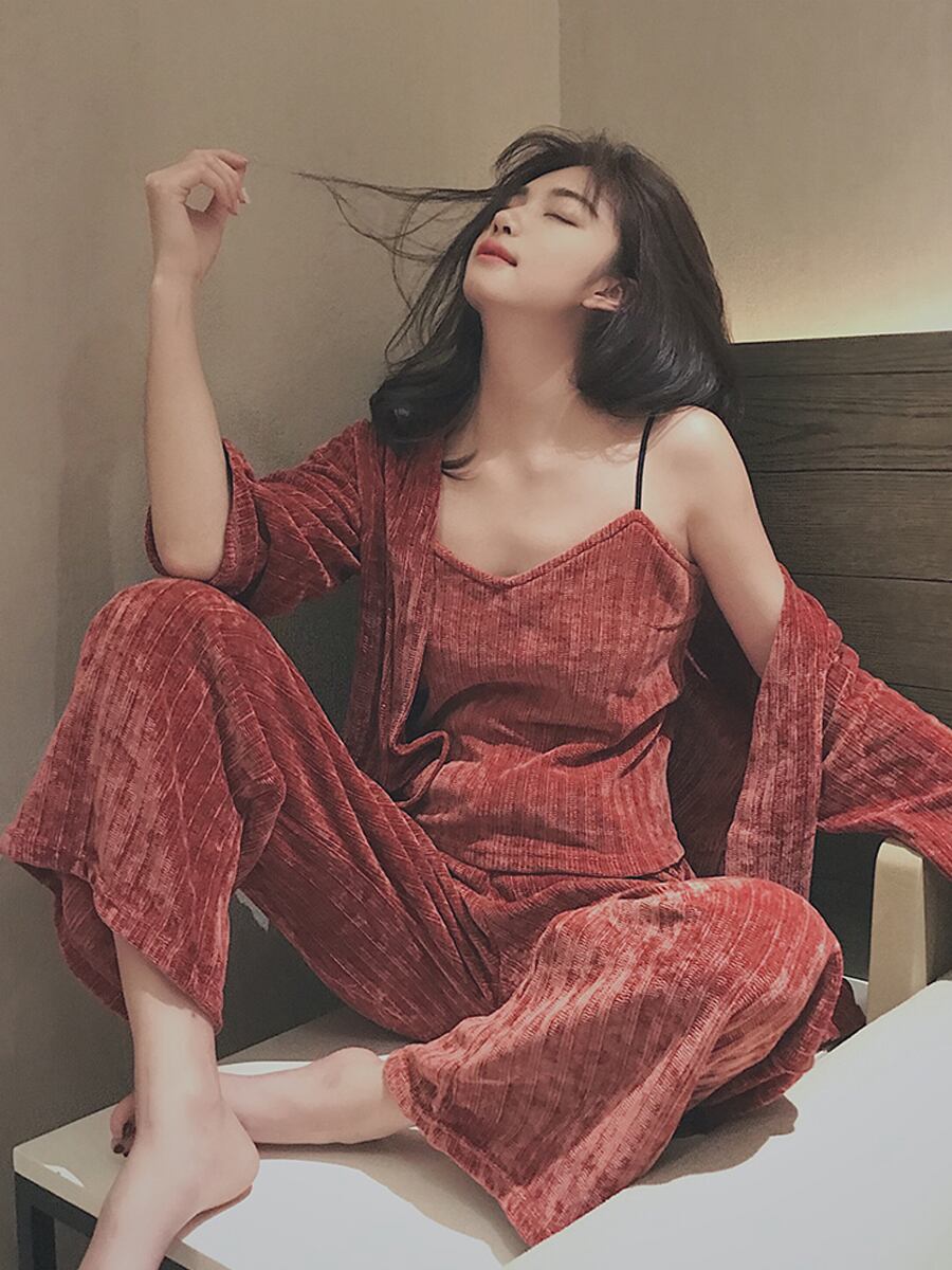 リッチな光沢を放つリブ編みベルベット生地のナイトガウン、キャミソール、ロングパンツの3点セット。