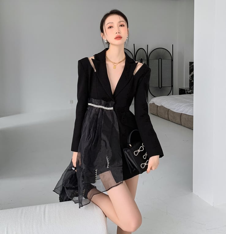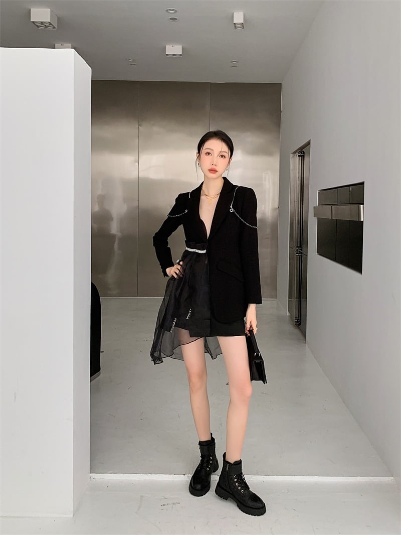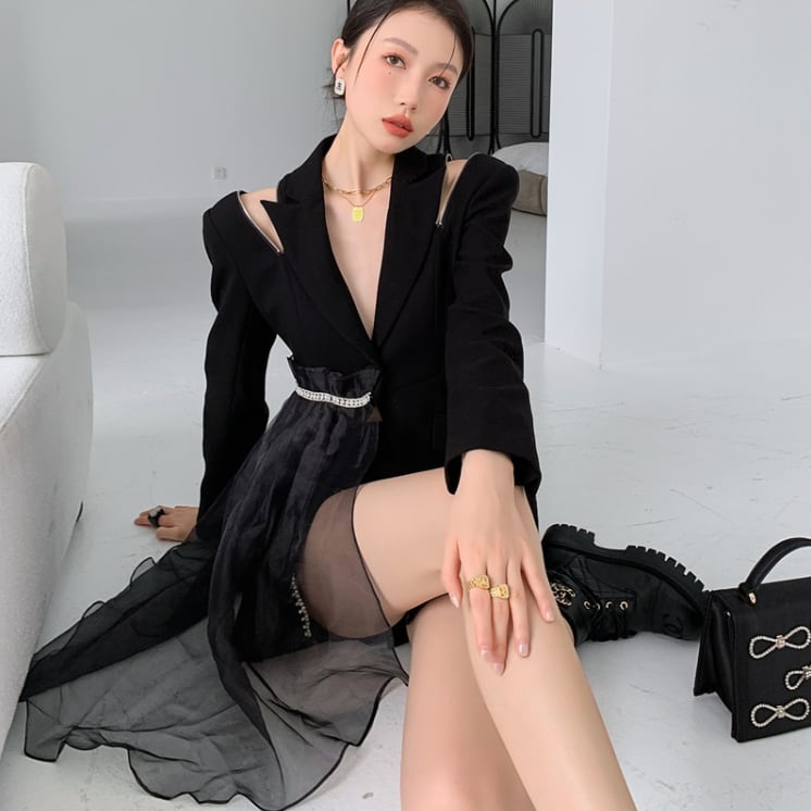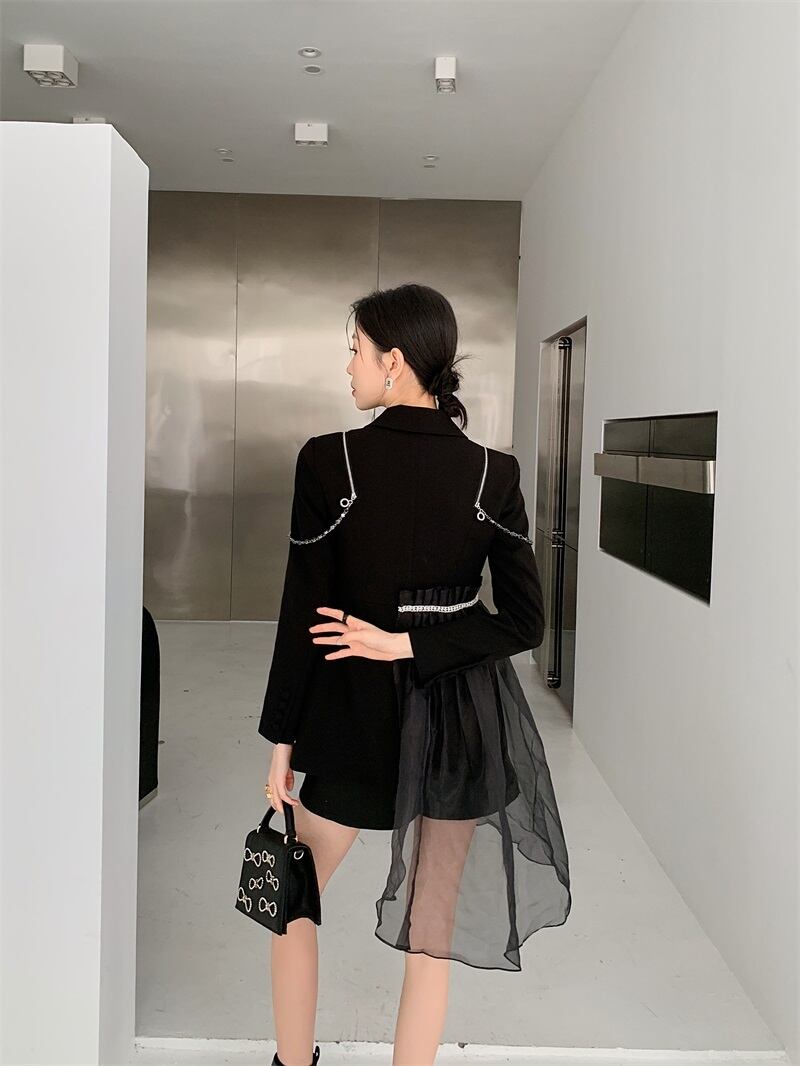 アシンメトリーデザインのジャケットにチュールをドッキングした異形デザインです。