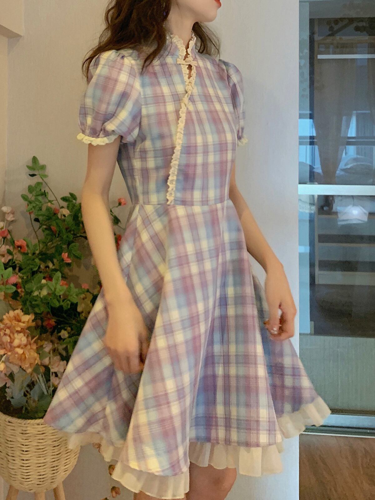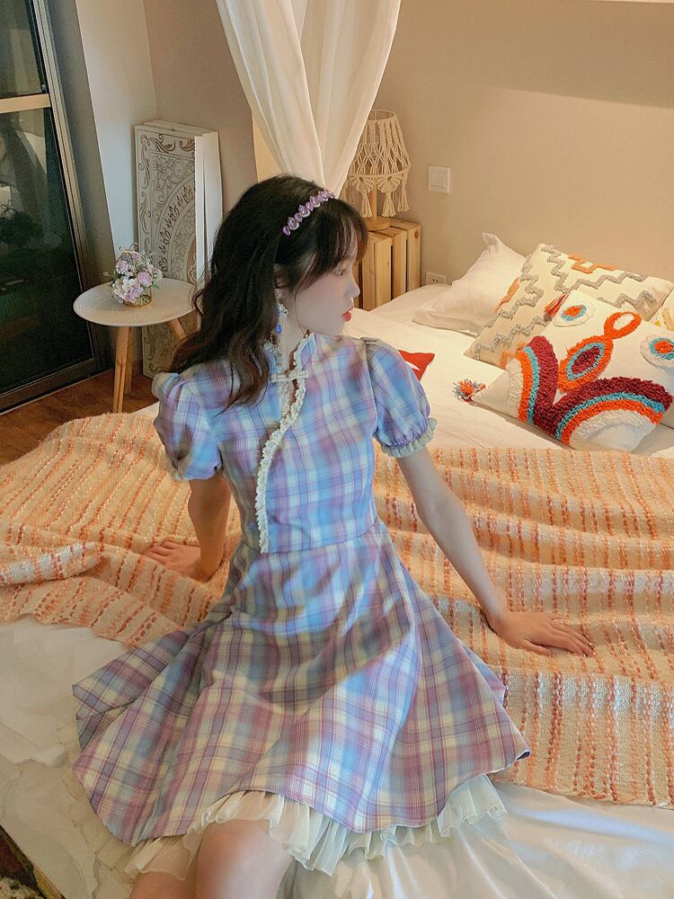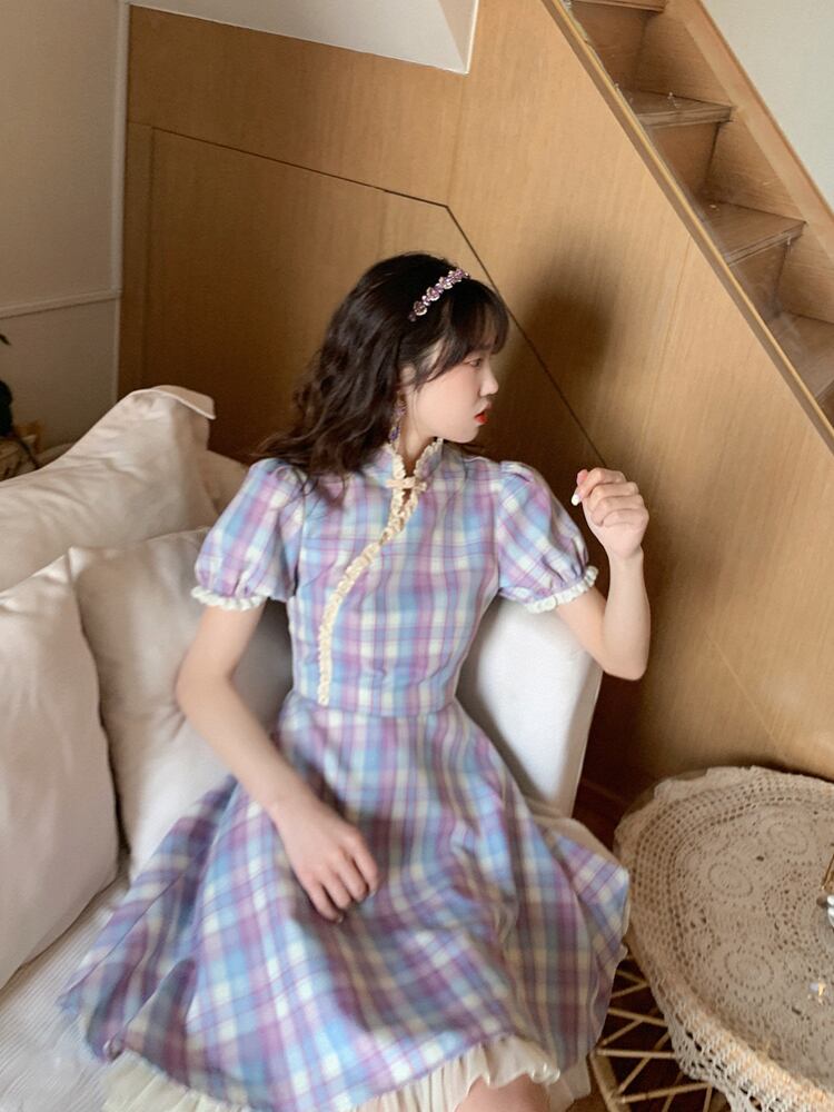 パーティードレス ミニドレス 発表会ドレス ステージドレス Aラインドレス ミニ丈 袖あり 半袖 パフスリーブ 襟付き スタンドカラー フレア レース フリル ハイウエスト かわいい 大人可愛い おしゃれ ラブリー キュート ガーリー 主役級 華やか 主役級 存在感 お姫様 お嬢様 清楚 チャイナ チェック柄 10代 20代 レディース デート 休日 パーティー イベント オルチャン 美脚 脚長 モテ インスタ映え 春 夏 二次会 お呼ばれ ステージ サイズ S M L 色展開 ブルー×パープル
