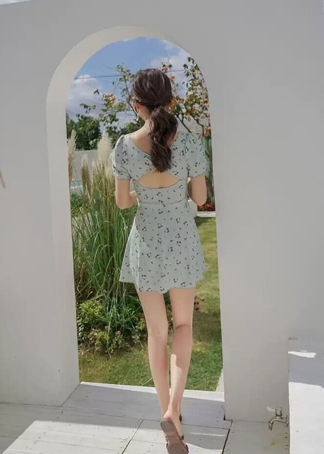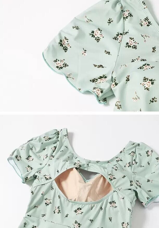 ワンピース水着 ショートパンツ パッド付き ハイウエスト シャーリング 盛れる セット 2点セット かわいい セクシー おしゃれ レトロ 存在感 ラブリー キュート ガーリー 背中見せ 小花柄 10代 20代 レディース 二の腕カバー 美脚 脚長 スタイルアップ 美スタイル オルチャン 定番 モテ インスタ映え サイズ M L XL 2XL 3XL 色展開 ミントグリーン