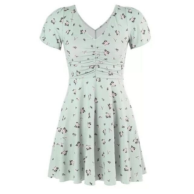 レトロっぽいデザインと、ミントグリーンの爽やかな色合いがマッチして、とてもキュートな印象に。二の腕まわりをカバー出来る、袖ありデザインが魅力的です。露出が気になる方にもおすすめで、普段のワンピ感覚で着られますよ。シャーリングが、胸元をさりげなく盛ってくれます。