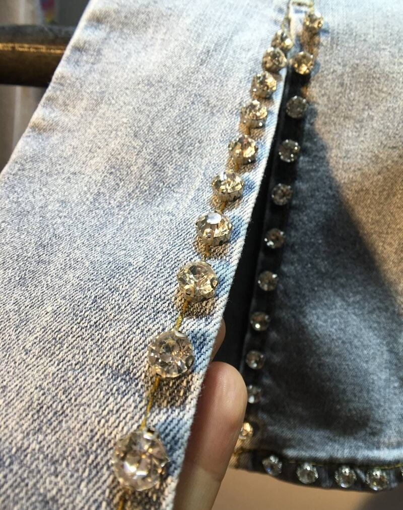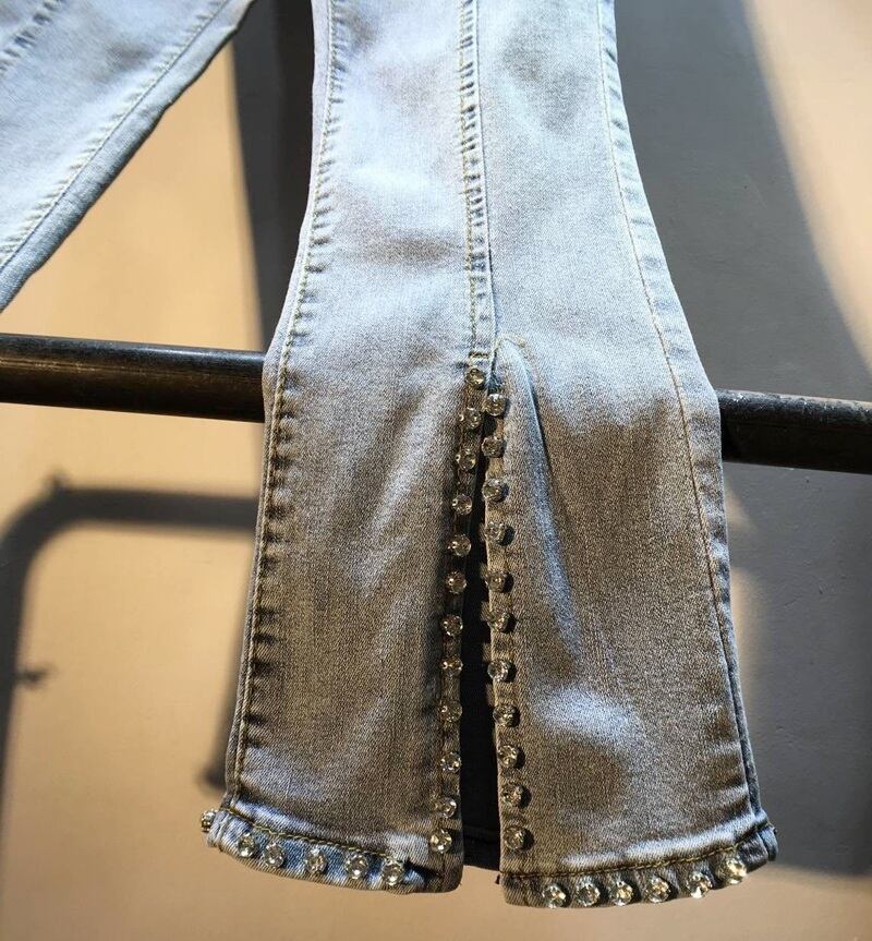 裾のビジューが大人可愛いフレアデニムパンツ。