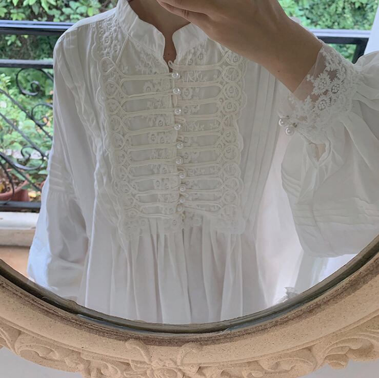 胸元と袖口に上品なレースで切り替えて高級感のある女性らしい雰囲気に仕上げました。