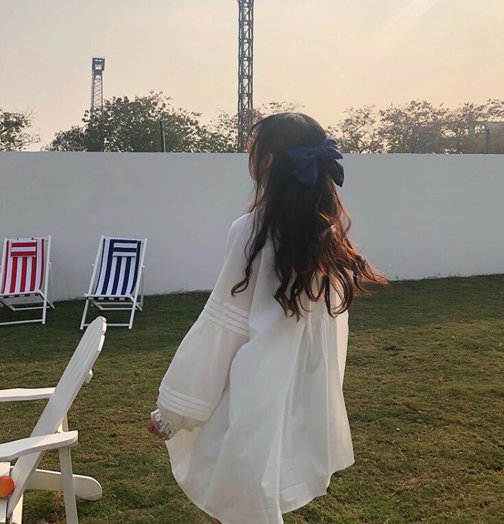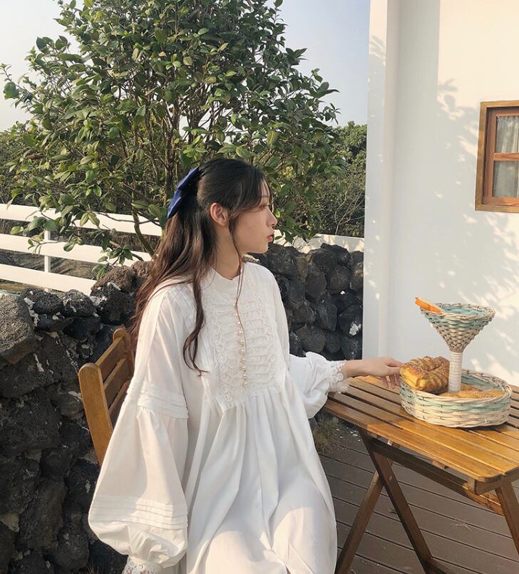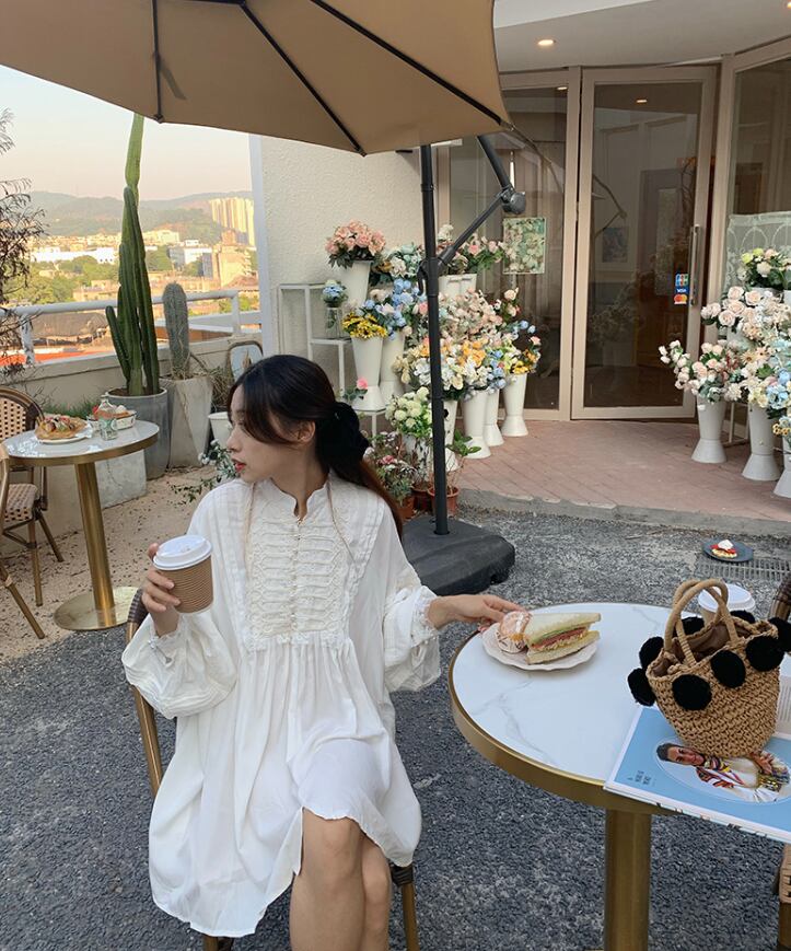 胸下切り替えからふわっと広がるAラインシルエットに立体感のあるパフスリーブが抜け感を演出。