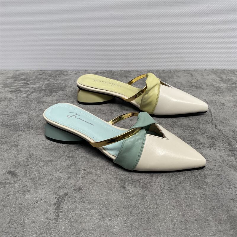 バイカラーがおしゃれなポインテッドトゥのミュール。