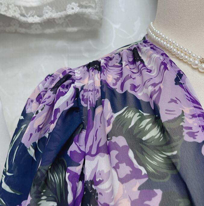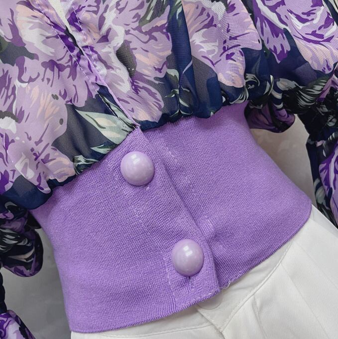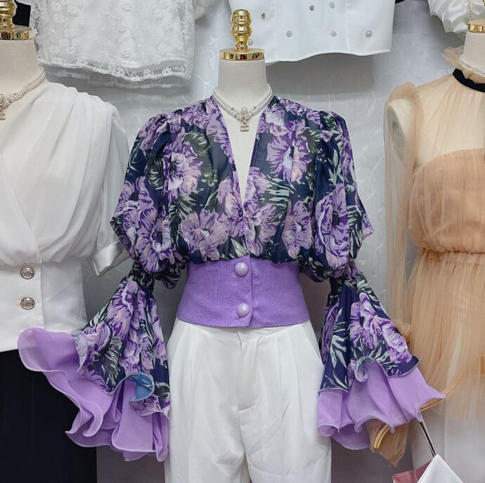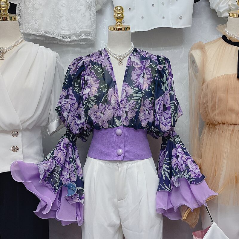 花柄ブラウス ブラウス 袖あり 長袖 ボリューム袖 Vネック シフォン ウエストマーク かわいい 大人可愛い きれいめ シンプル カジュアル 大人 上品 おしゃれ お洒落 レトロ 大人可愛い 大人女子 こなれ感 ラフ キュート ルーズ 個性的 主役級 存在感 柄 花柄 春 夏 秋 10代 20代 30代 レディース OL 通勤 学生 通学 デート お出かけ 女子会 休日 着回し 普段使い 重ね着 オルチャン 色展開 紫 パープル
