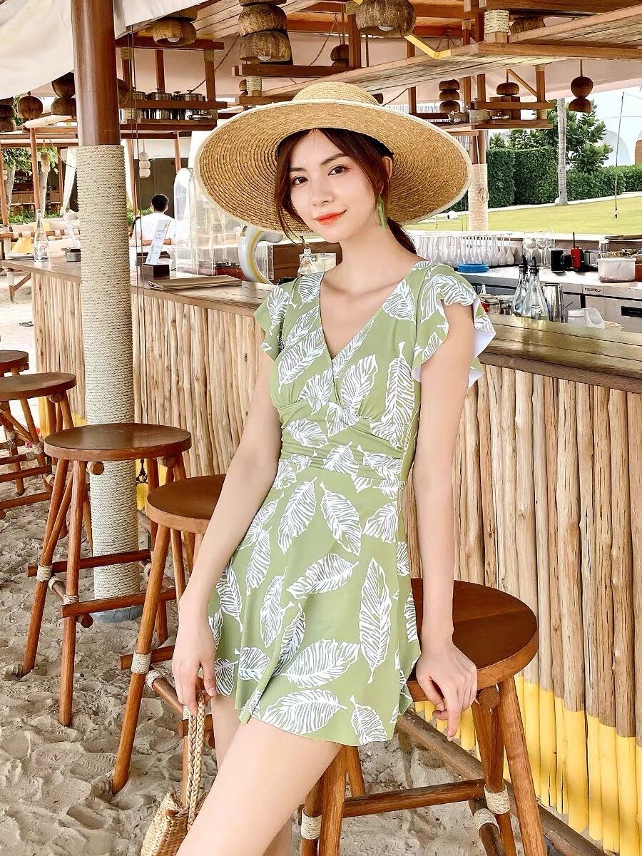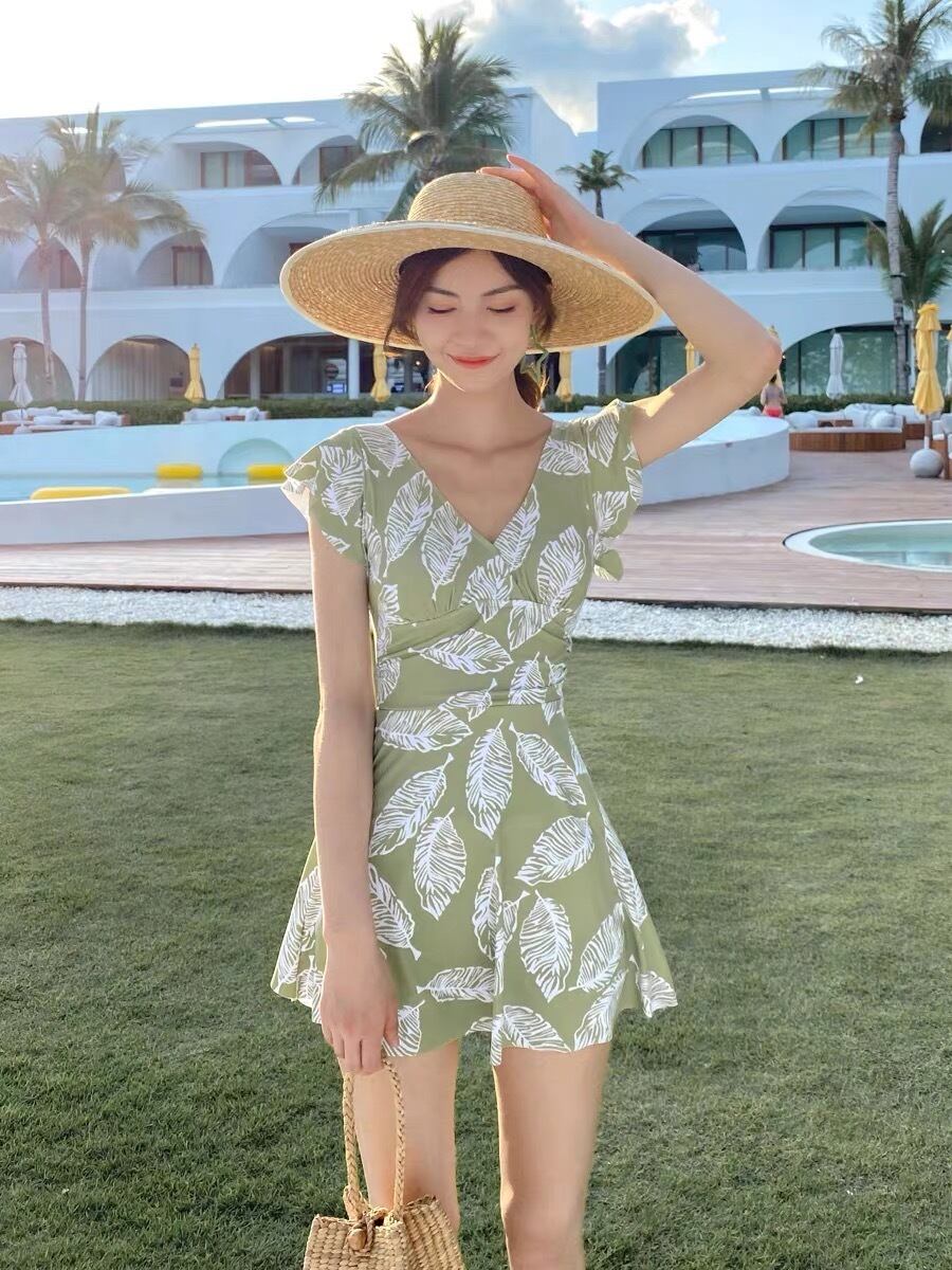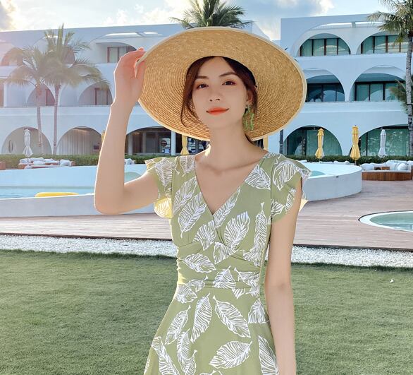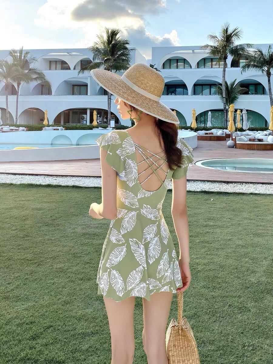 フレア ワンピース水着 体系カバー 二の腕カバー バッククロス かわいい 大人可愛い シンプル おしゃれ レトロ ラブリー キュート ガーリー リーフ柄 10代 20代 30代 レディース 美スタイル オルチャン 定番 モテ サイズ M L XL 2XL 色展開 ライトグリーン